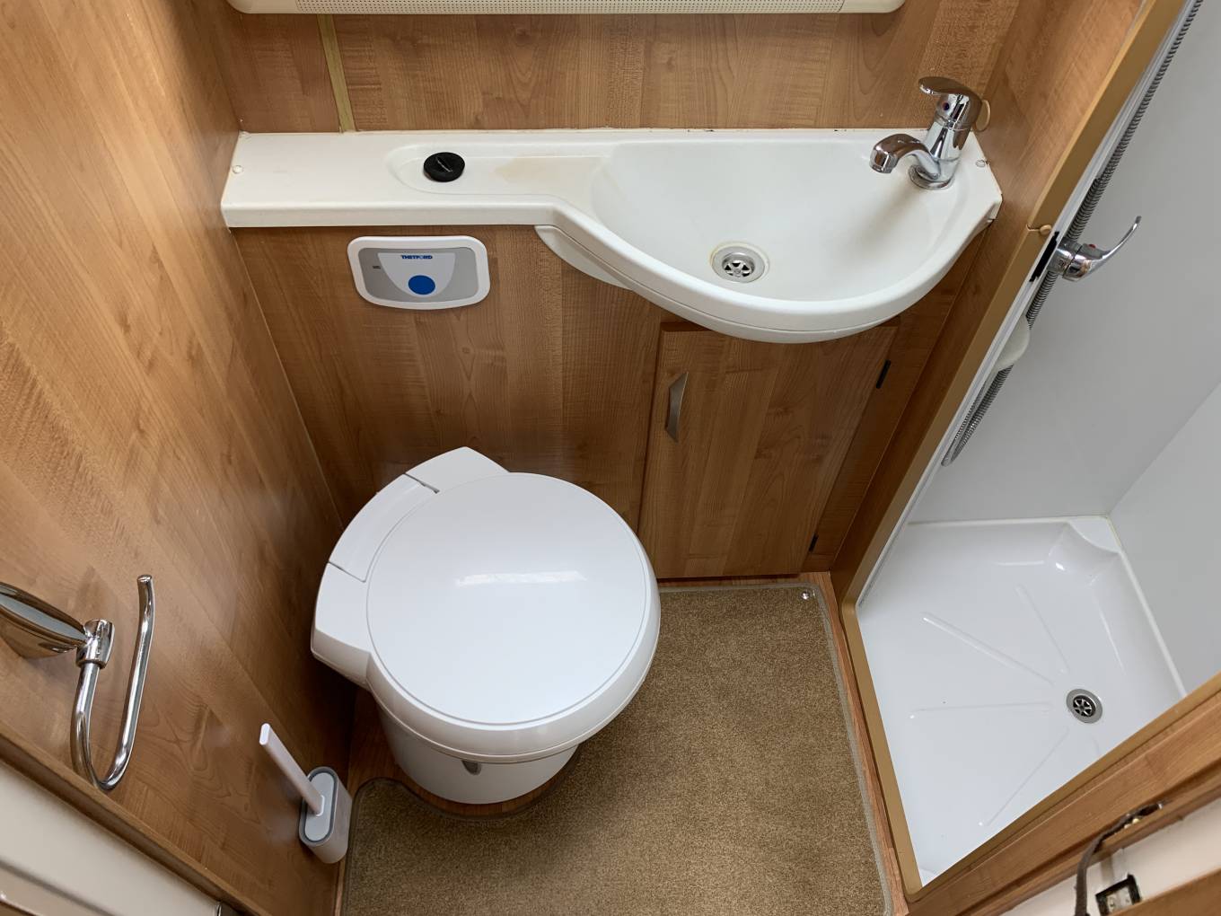 The washroom boasts a separate shower cubicle Thetford electric flush toilet and wash basin.