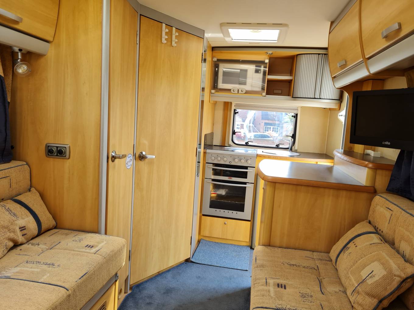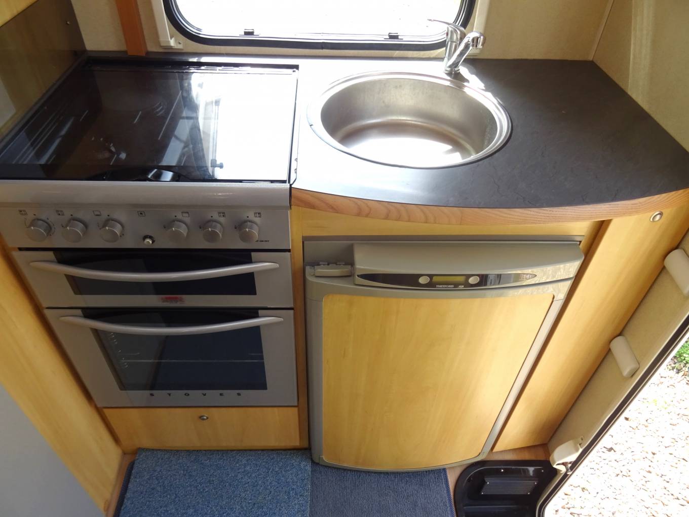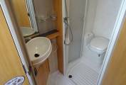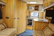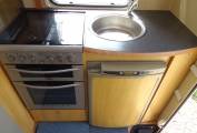The layout is end kitchen and is all very clean and well equipped: Microwave - Stoves Gas Oven/Grill - 3 Gas Hob Burner and Electric Hot Plate - 3 Way Fridge with Freezer Box - Sink with Mixer Tap and Drainer - Overhead Storage. At the other side of the rear nearside Habitation door is a workstation with pull out rack and cutlery drawer.