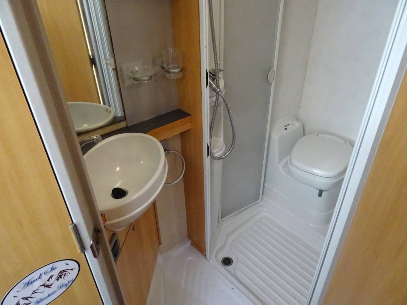 Moving up the drivers side is the washroom with shower, electric flush toilet, sink, mixer tap, storage, mirror, 2 solid bi-fold separator doors. Adjacent is a large hanging wardrobe.