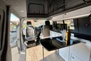 On entering the side door you have a kitchen area with sink, 2 gas rings, fridge freezer with worktop and an ample amount of storage space. The passenger captain seat swivels round making the central seating area very comfortable and a great socialising space with a removable table. To the rear the seating area easily converts into a good size double bed again with plenty of storage underneath.