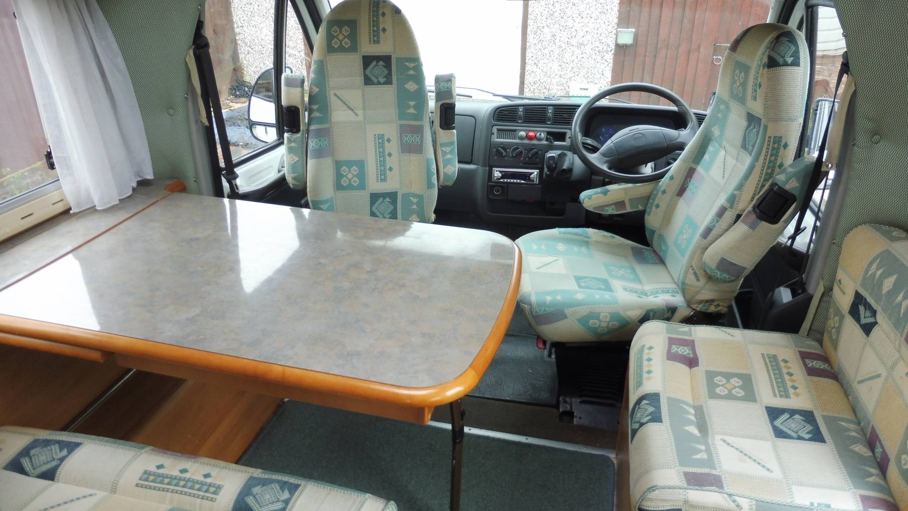 When you enter the motorhome through the habitation door you have the central dinette that can easily seat 5 when you use the swivel seats in the cab. There are 4 seat belts in total.