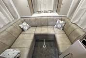 On to the rear U shaped lounge with a removable pedestal mounted table, the second Television and from above an electrically powered bed comes down.