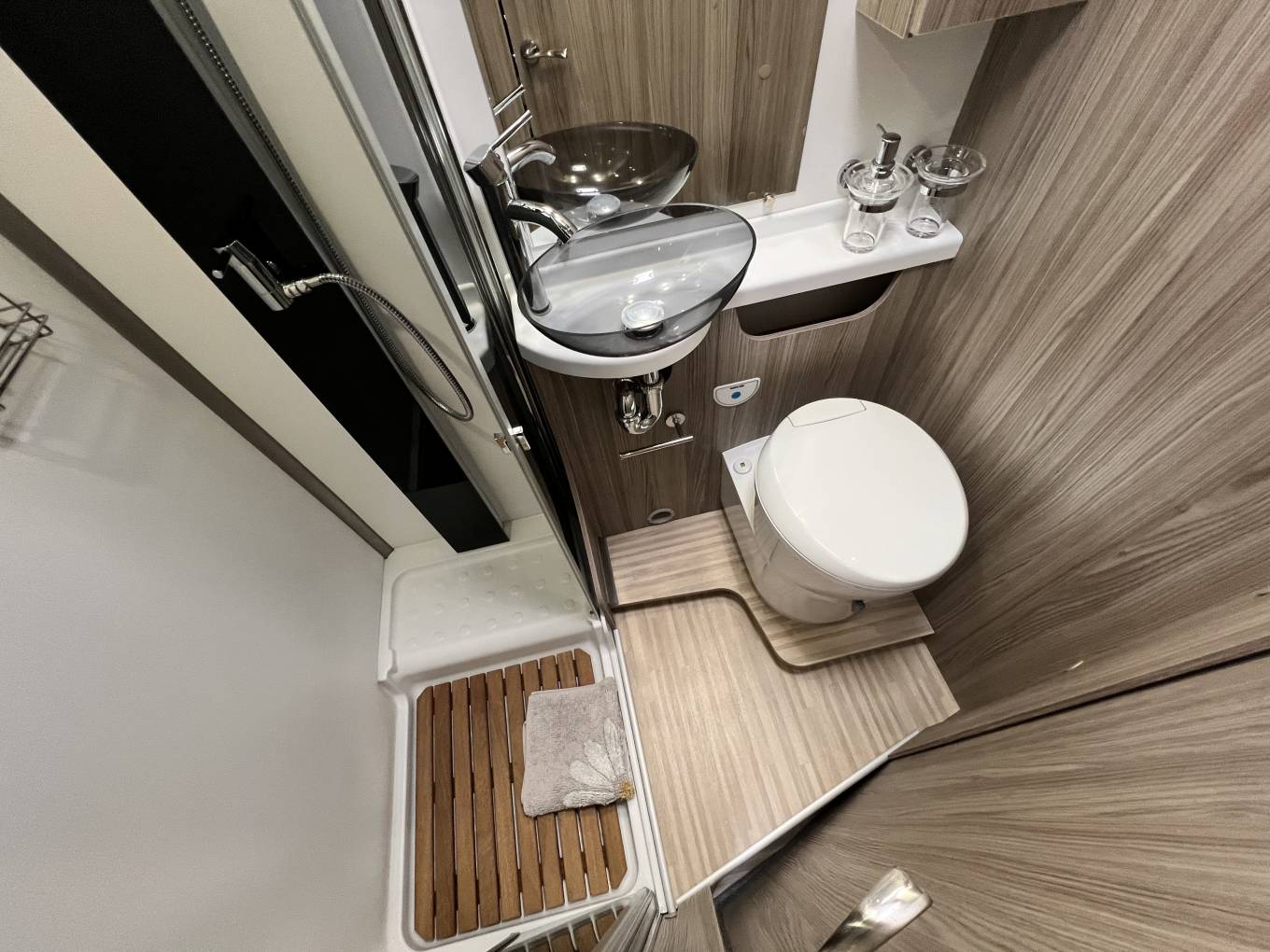 Opposite the kitchen is the bathroom consisting of a Thetford electric flush cassette toilet, a Wash Handbasin, cupboard space and a separate shower cubicle.