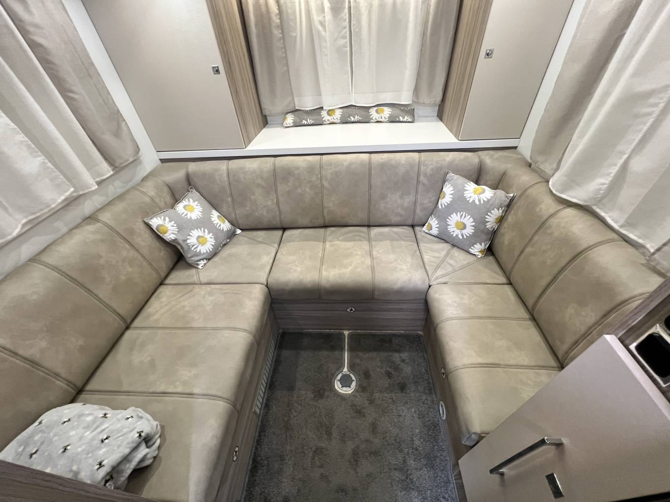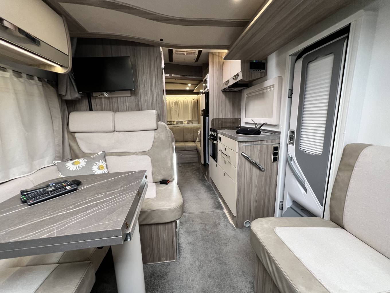The centre pedestal mounted table extends for dining and the front double bed come down from the ceiling via an electric motor.