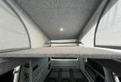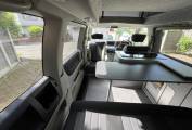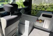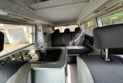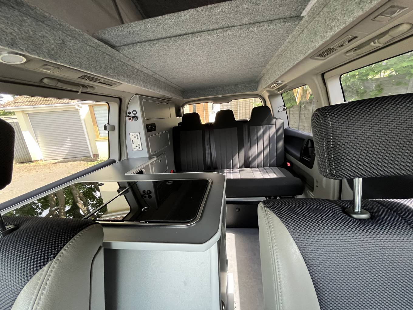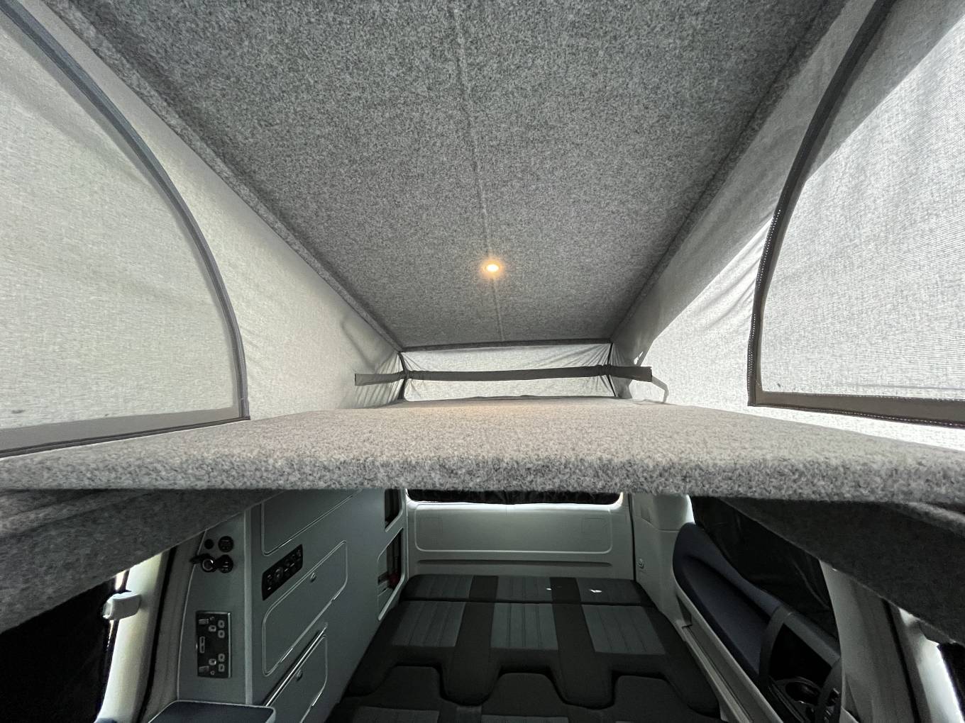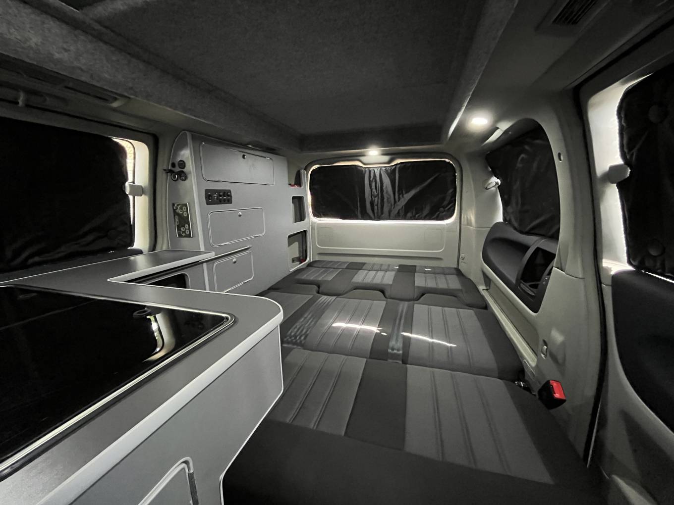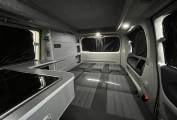 The campervan conversion includes essential amenities for a comfortable stay on the road. It features a compact kitchen equipped with a sink, refrigerator, and stove. A foldable dining table, and storage cabinets are part of the setup.