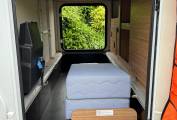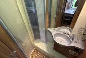 In front of the beds you will find the washroom which has everything you need including shower cubicle, wash basin, toilet cassette and large vanity mirror. Underneath the beds you have another 2 large storage areas. The kitchen area is mid habitation and includes a three way fridge with freezer space, sink with hot and cold mixer tap, 3 gas rings and an oven/grill combi and again more storage for all your kitchen needs. The owner has also made a lovely extra table top that stores away nicely and fits on to the end of the kitchen unit and acts as extra prep area.