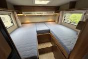 Layout - Starting at the rear you have a large spacious area that is home to 2 single beds that can make a large double bed and you also benefit from surrounding storage lockers and beautiful lighting. Here you also have a TV that comes with Satellite which is a lovely feature to have in the bedroom area.