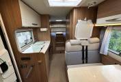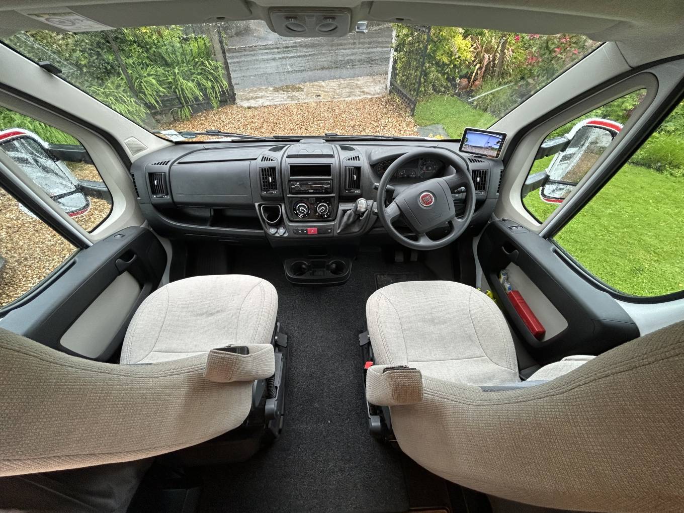 Moving forward you have the centre dinette area which allows you to travel 2 extra people and offers another area to relax. This area can be turned into a four-seater dinette when you take advantage of the front swivel seats and can make this space into a small bed for a child. The cab area is where you will find comfort and a host of extras which all help make this motorhome a safe and comfortable drive including Cab Air Con, USB Port and Reversing Camera that gives a clear picture and can act as a mirror while you drive. You also have a large garage at the rear of the motorhome that runs the width of the motorhome ensuring nothing is left behind on your next adventure.