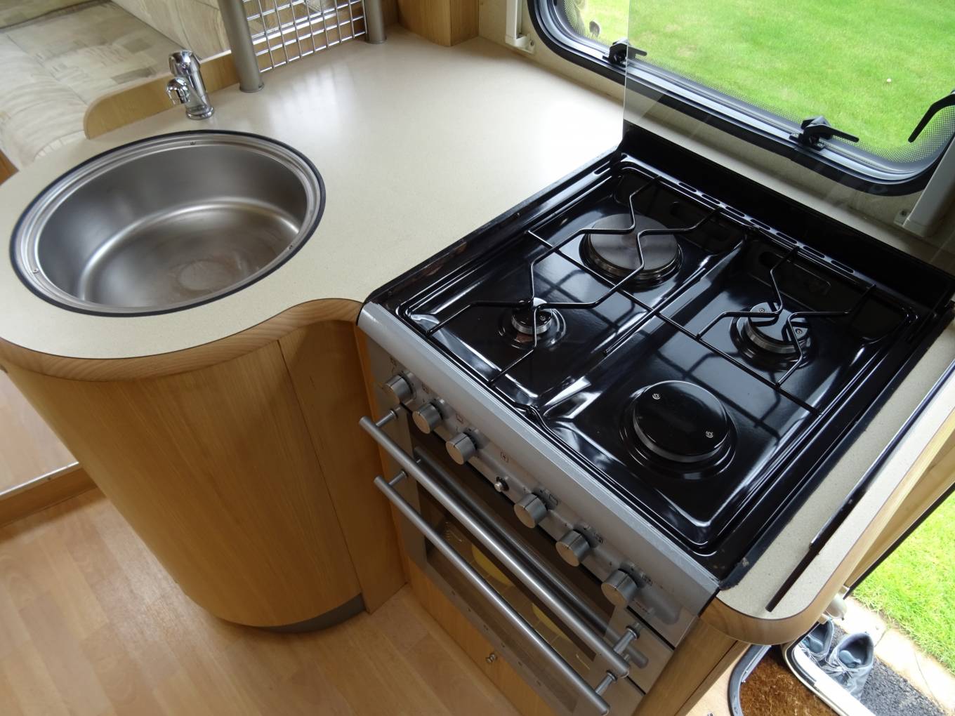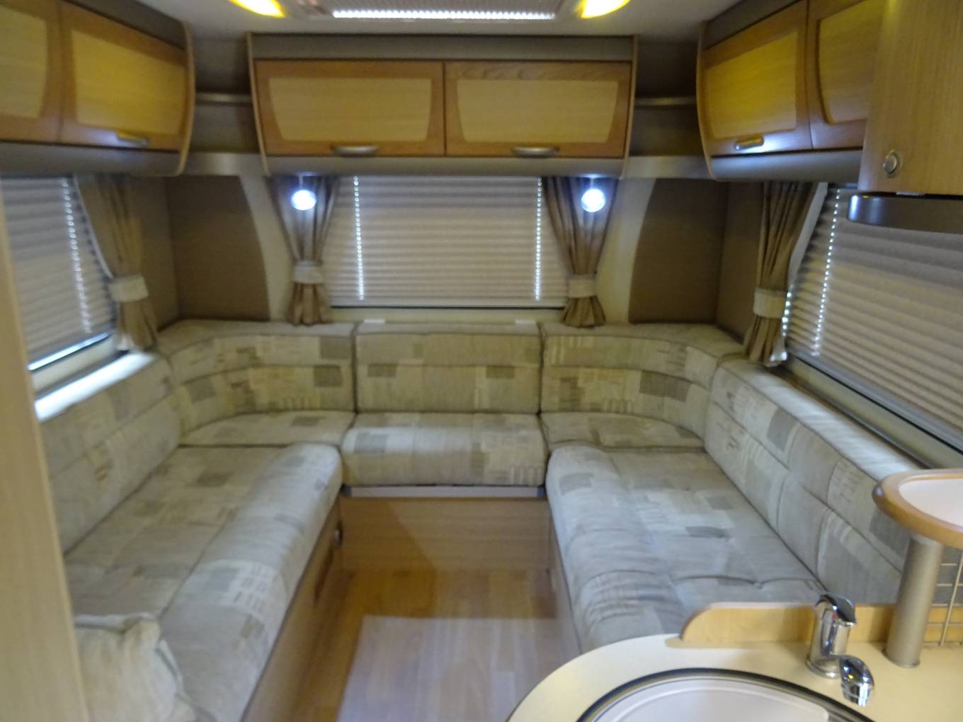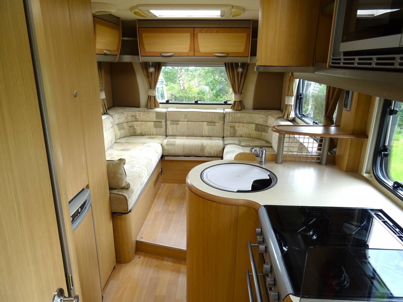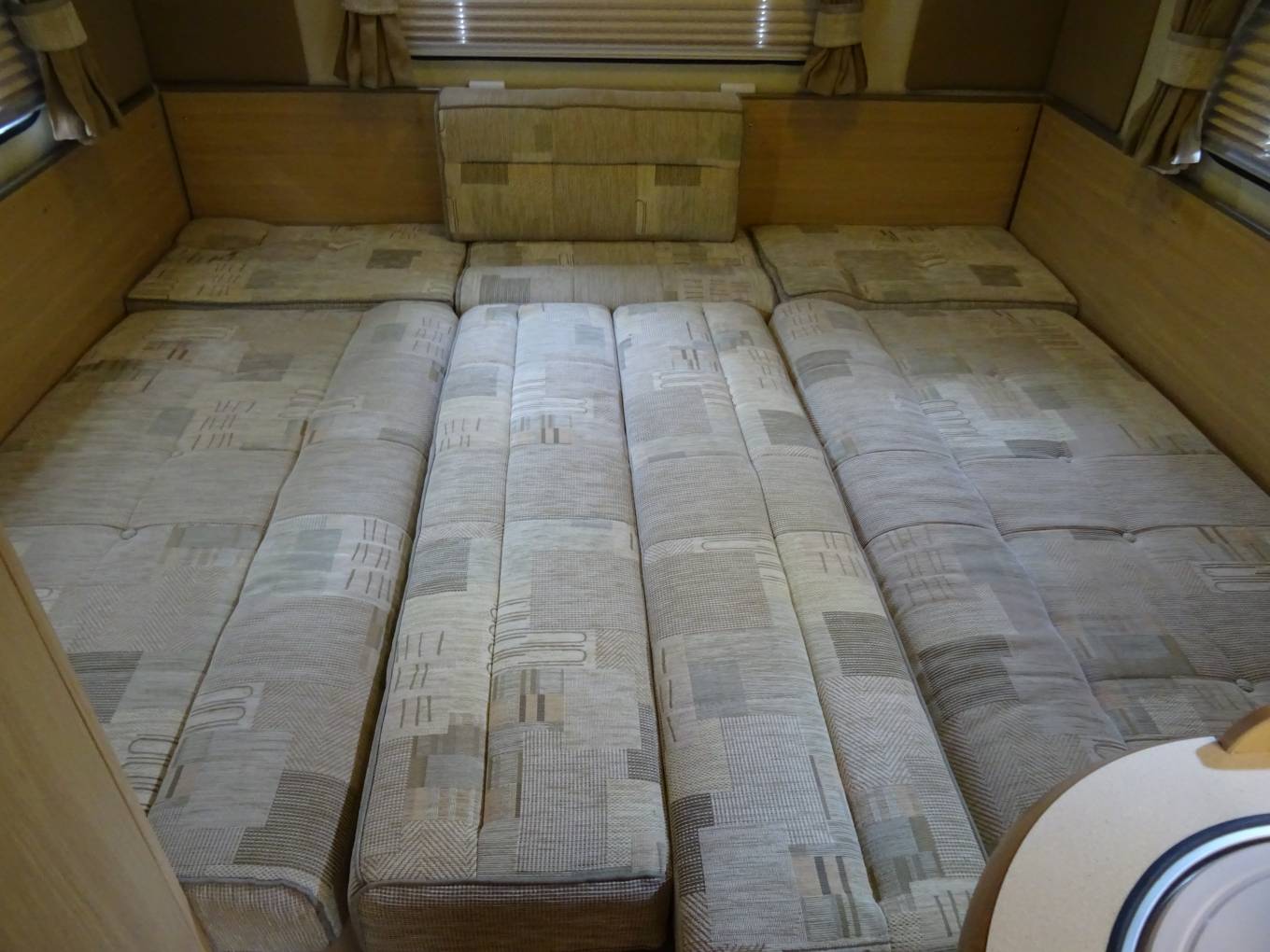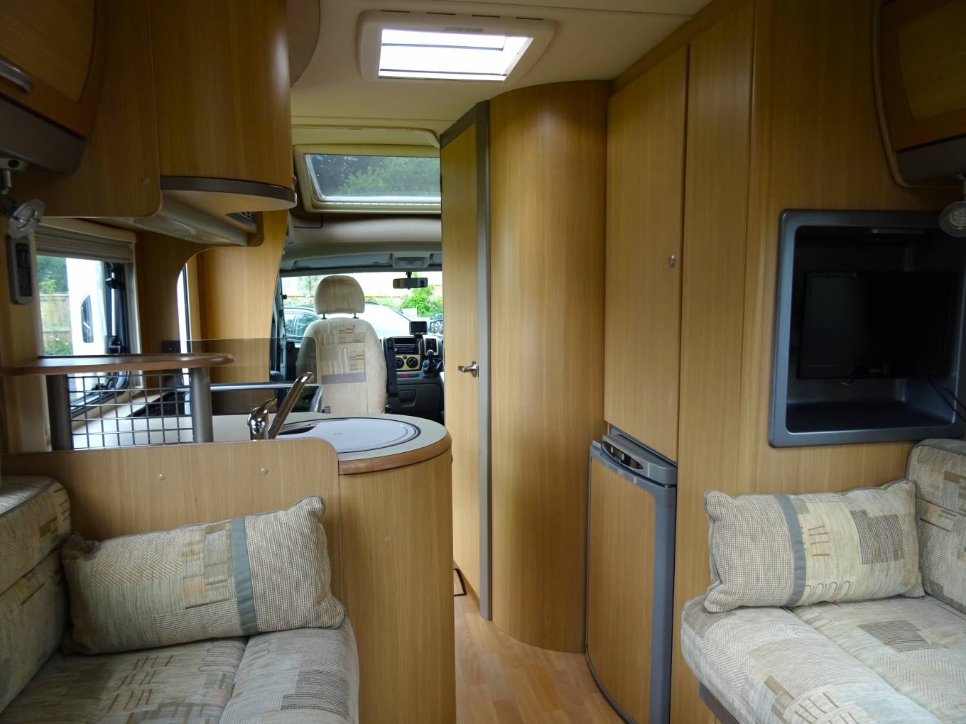Up front the Fiat Ducato is very easy to drive with light controls yet plenty of power, electric windows and mirrors and cab air conditioning . Plated at 3500KG, the Bessacarr can be driven on a standard car licence. The cab area can be quickly screened off at night using the integrated blinds and the passenger seat swivels to offer extra daytime seating.