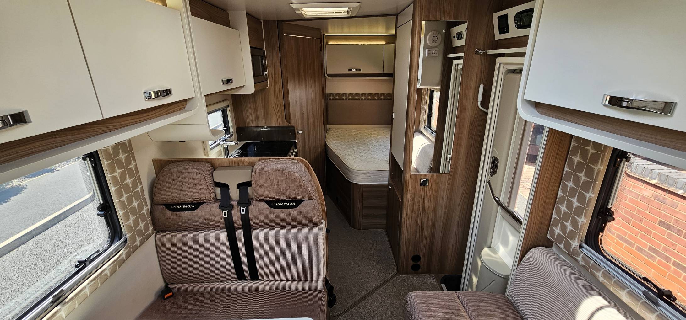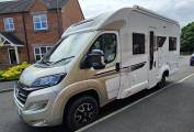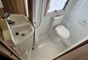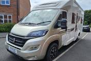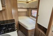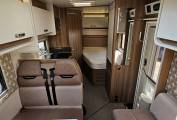 This stunning Champagne edition sleeps and travels four people and is finished in gold externally with the "special" upholstery inside. At the rear you find the fixed French double bed with ample storage below and in the lockers above, to the side you have very roomy washroom including WC, Wash Basin, Storage unit and large Halo shower with curtain.