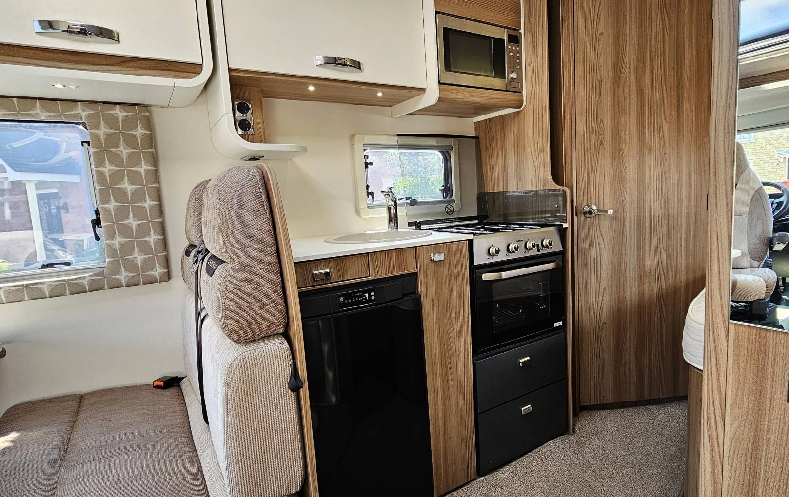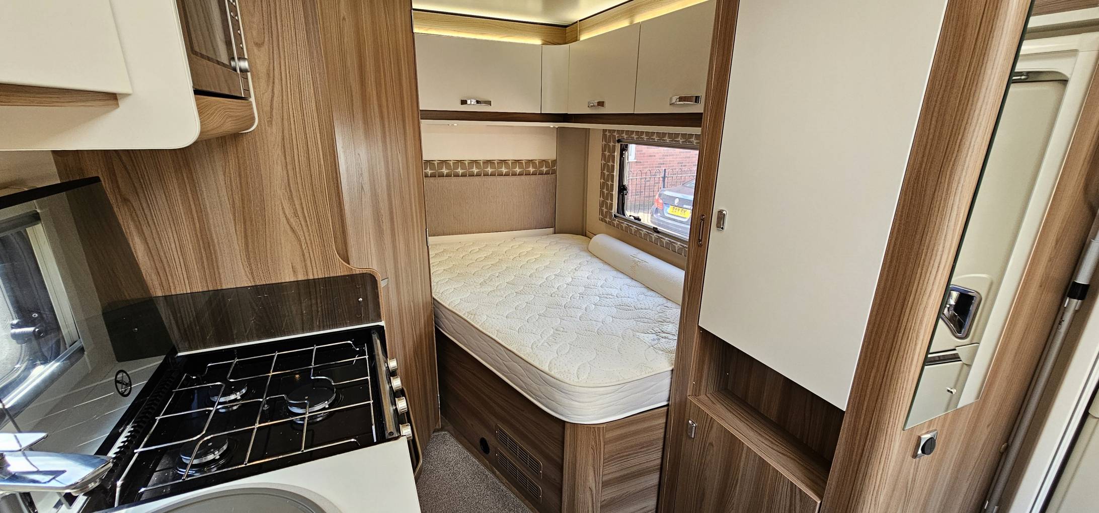 Moving forward you will find the well-appointed kitchen with 3x Gas ring Hob, 3-way Fridge, Oven, Sink and Microwave opposite this is the good-sized wardrobe.