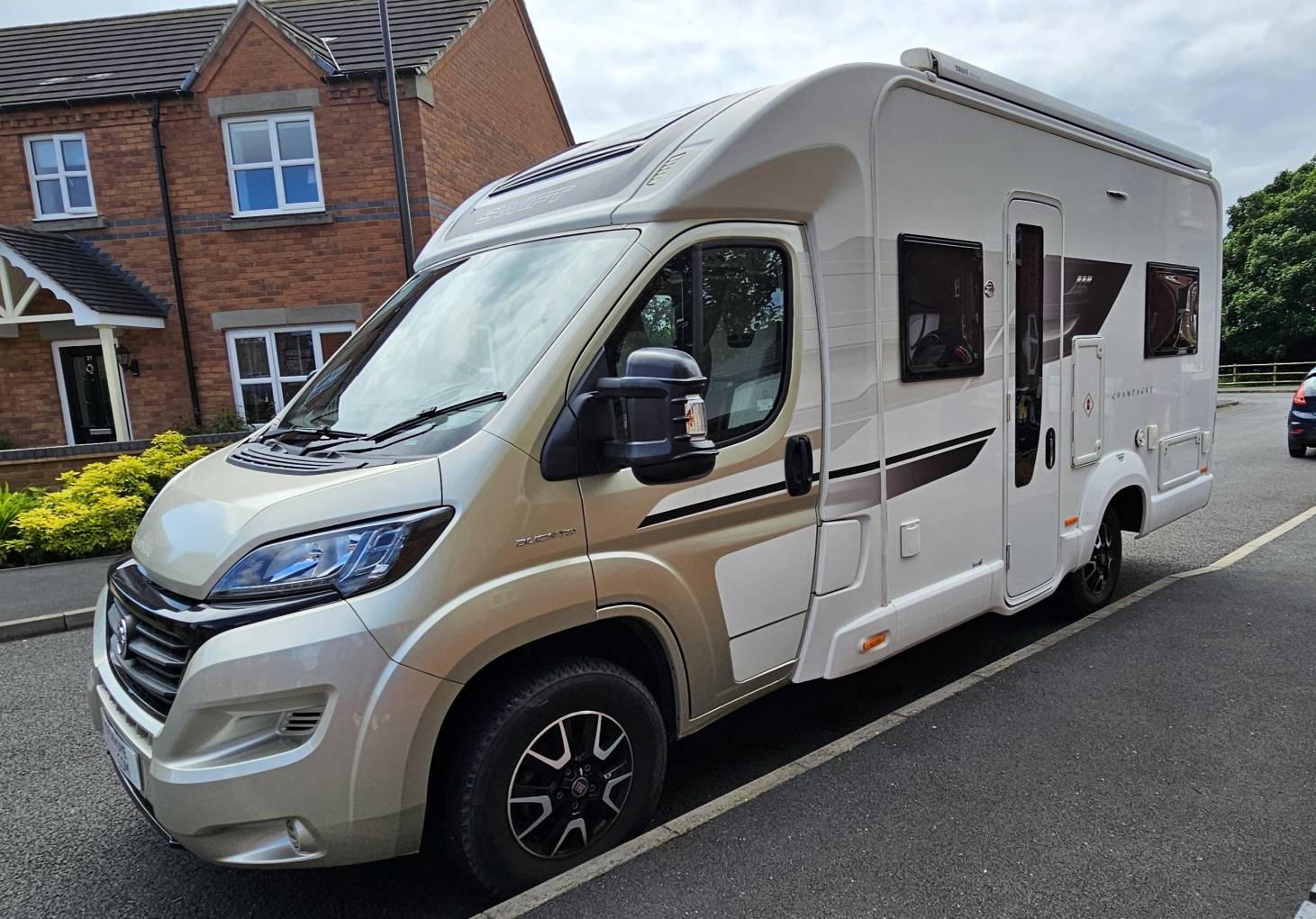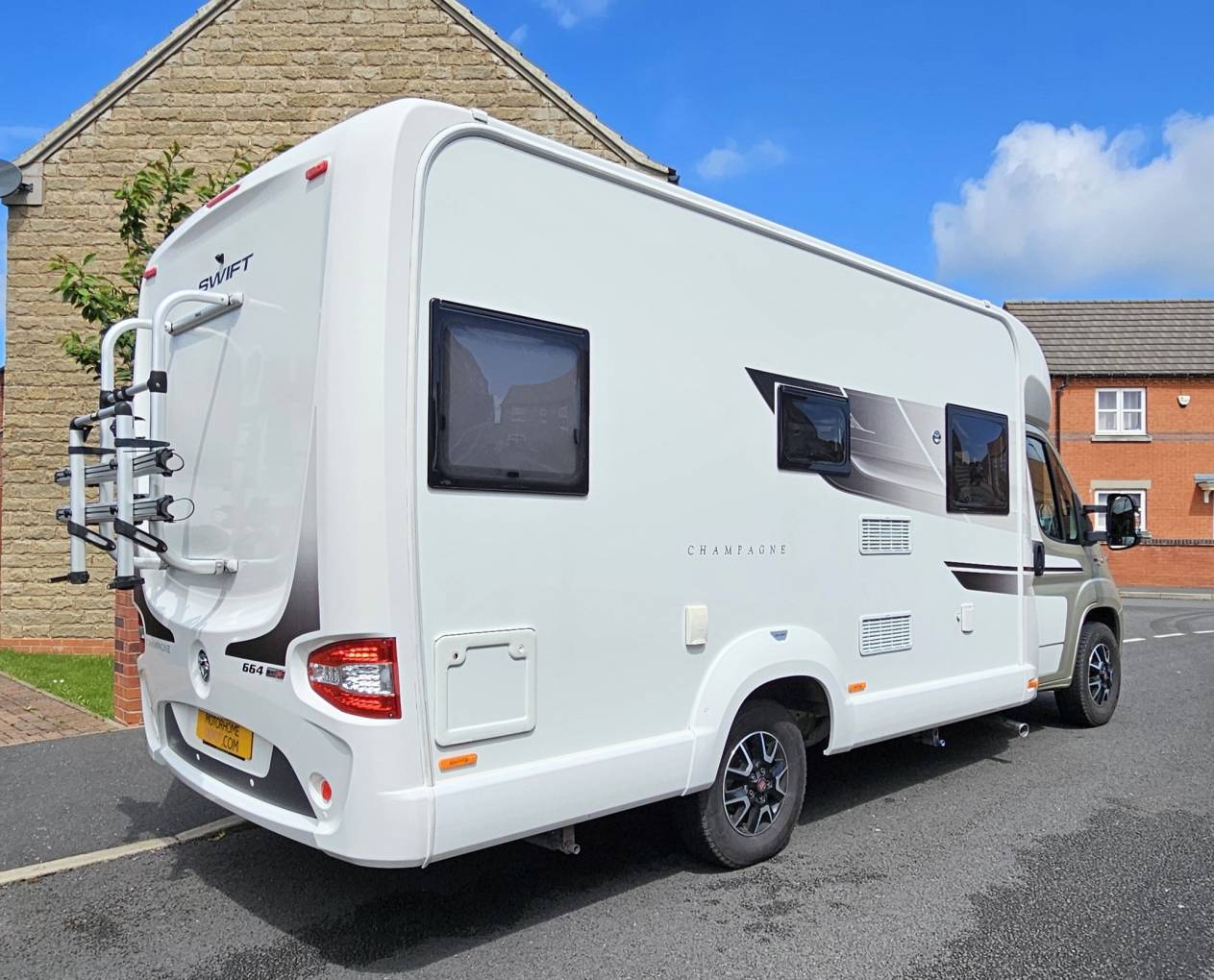 Not only does the Champagne Edition stand out due to its colour, it also comes fitted with extras such as: Alloy Wheels, External BBQ, Shower and 240 socket, Thule Bike Rack, Thule wind out Canopy, Reversing Sensors, TomTom Sat Nav, Central Locking for all doors, Heated water tanks with electric drain down valves for both waste and fresh tank, Reversing Camera, 150w Sargent Solar Panel, Sargent Tracker (requires subscription) and extra 240 sockets inside the habitation.