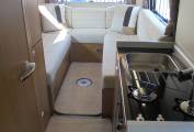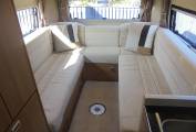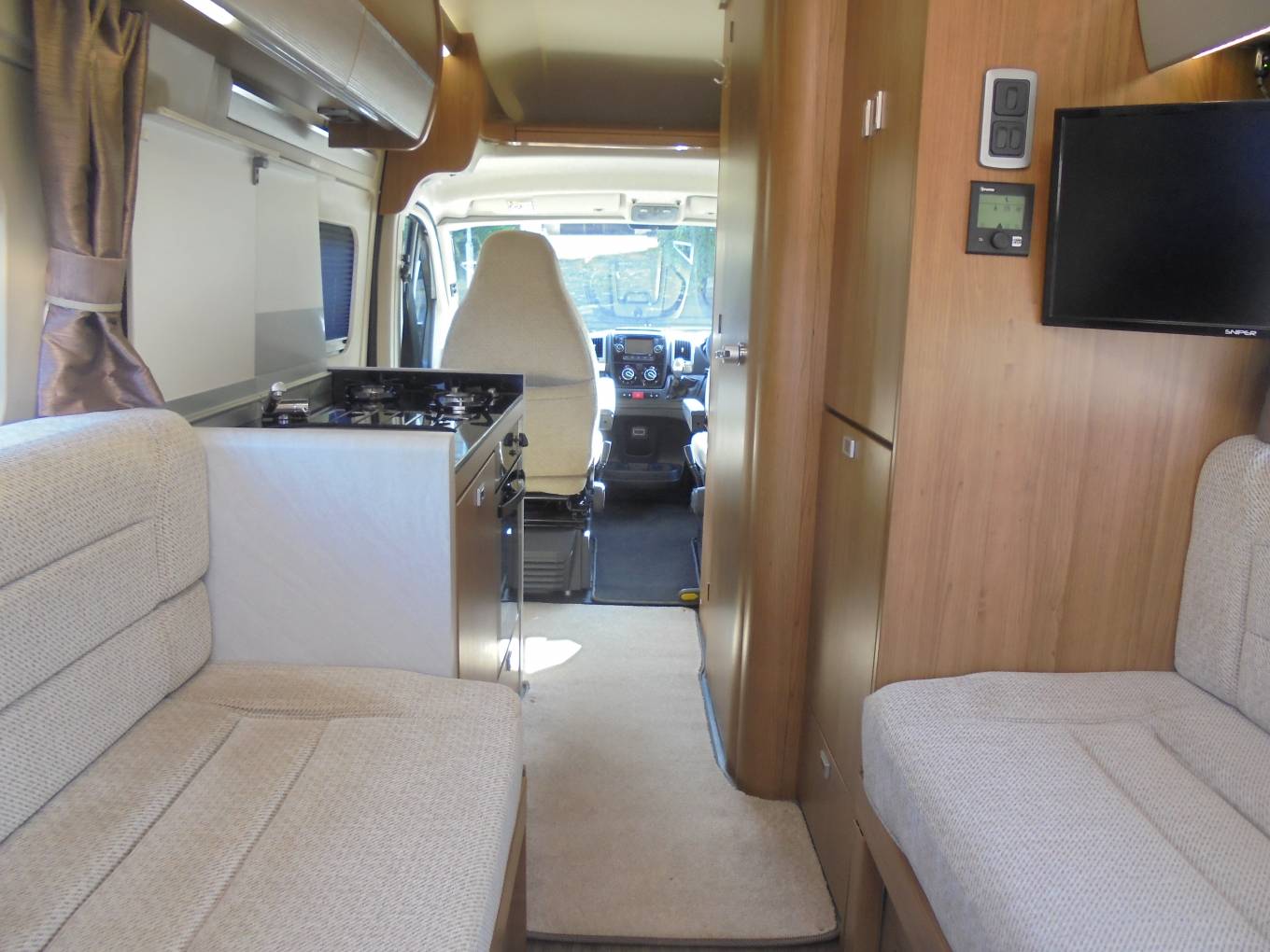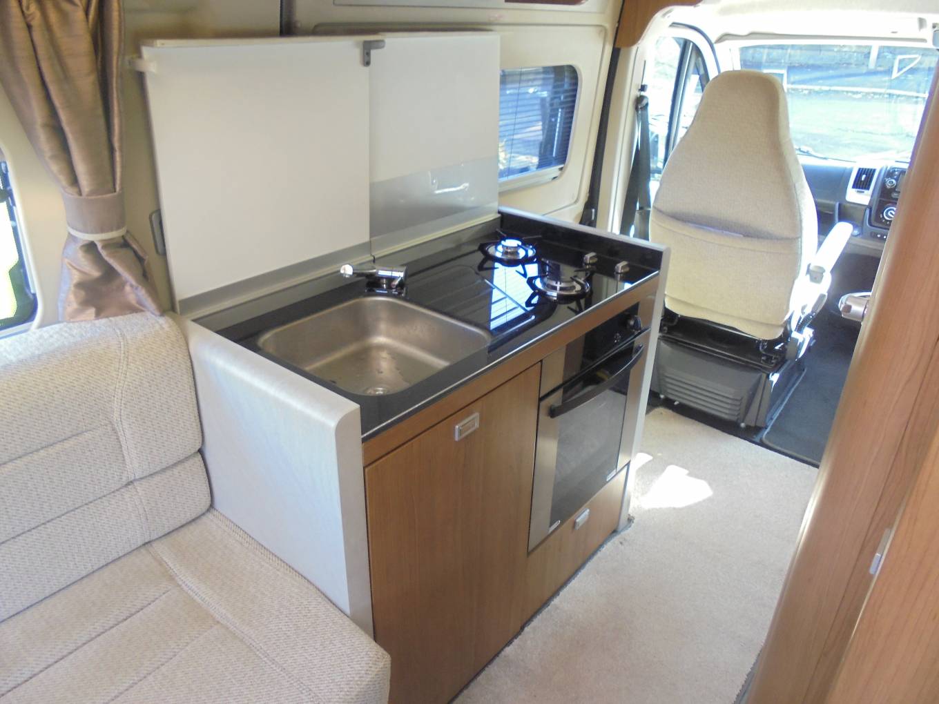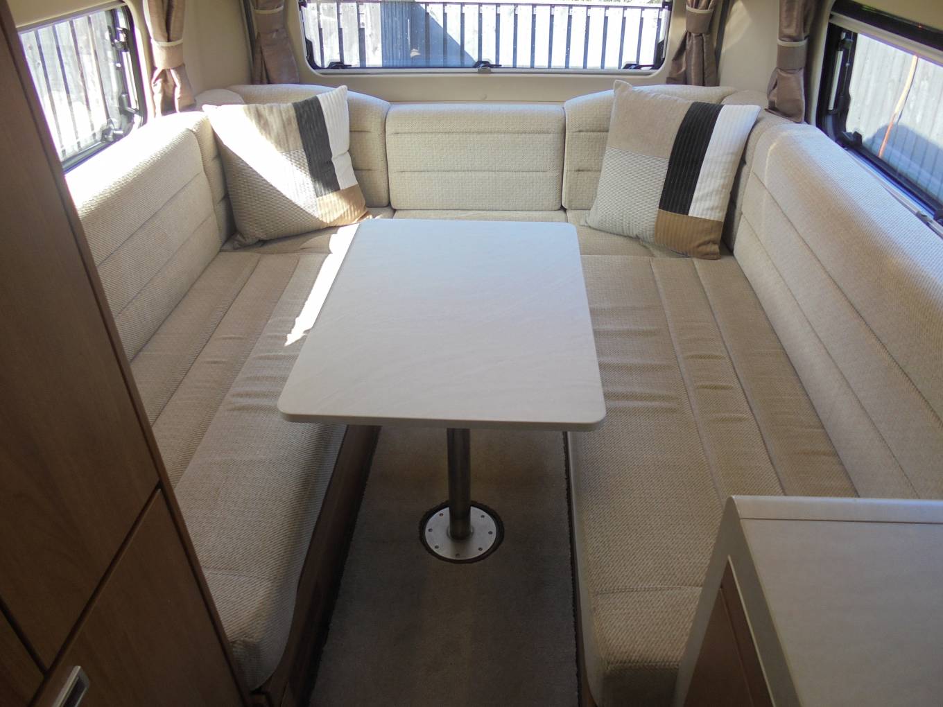 The layout from the rear has the sought-after U-shaped end lounge, which easily converts at night into a large double bed or can be used as two single beds this area has full round panoramic windows and has a fitted TV/DVD player with aerial. Further forward you have a fully functional wet room with cassette toilet and shower, adjacent you have the kitchen area which has a 2 gas burner hob, sink, oven and grill which is a rarer find in this class of motorhome, there’s also a three-way fridge freezer under the wardrobe and further forward to the cab area the 2 seats swivel when needed.