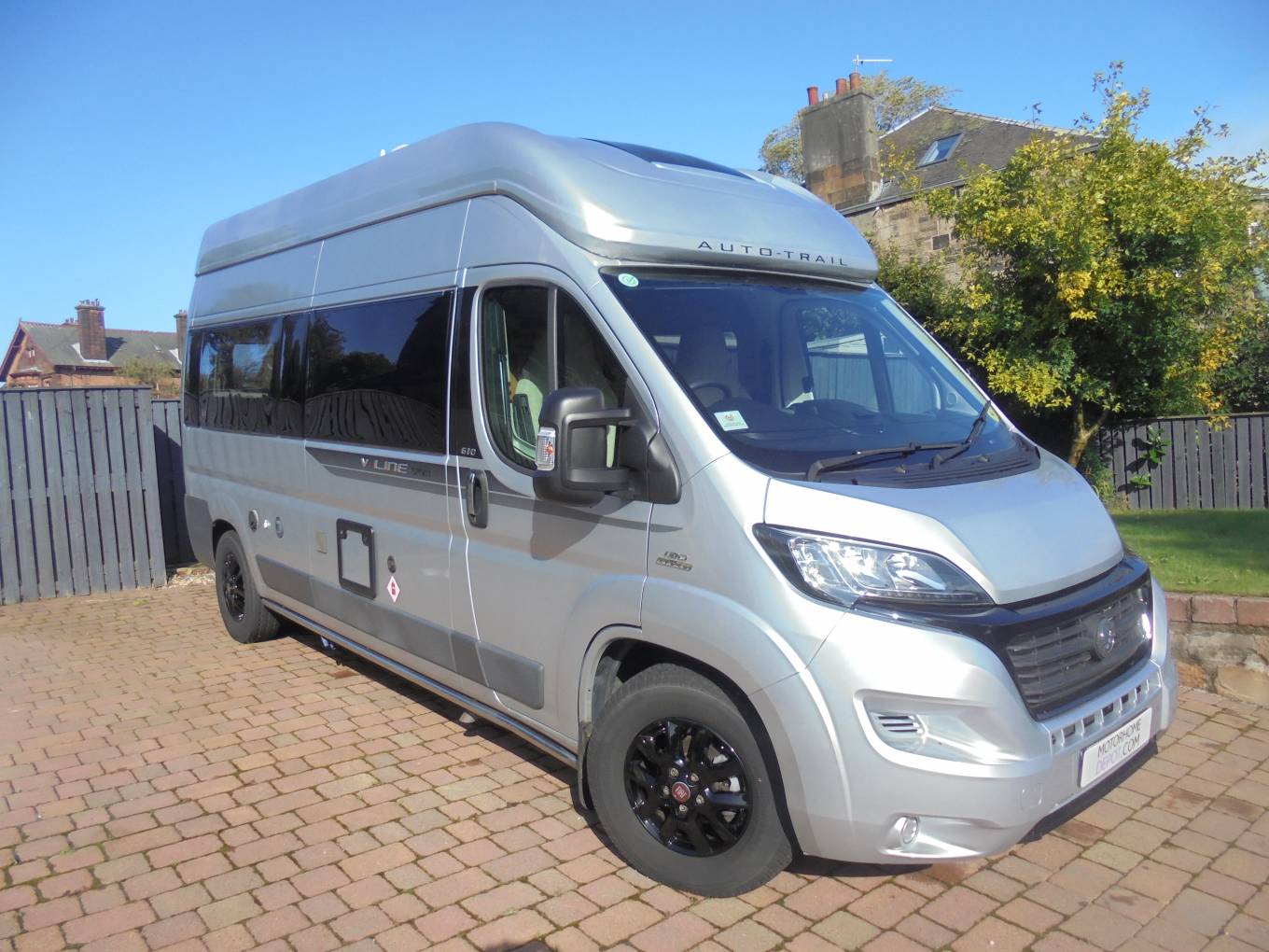 Motorhome Depot Glasgow is delighted to bring to the market one of Auto-Trails luxury top of the range V-Line 610 Campervans. This model is unique for having automatic transmission, a U-shaped rear lounge and it is upgraded to the sport edition giving more desirable upholstery, upgraded130bhp engine, black gloss alloys and stainless steel foot sidebars all around.