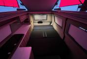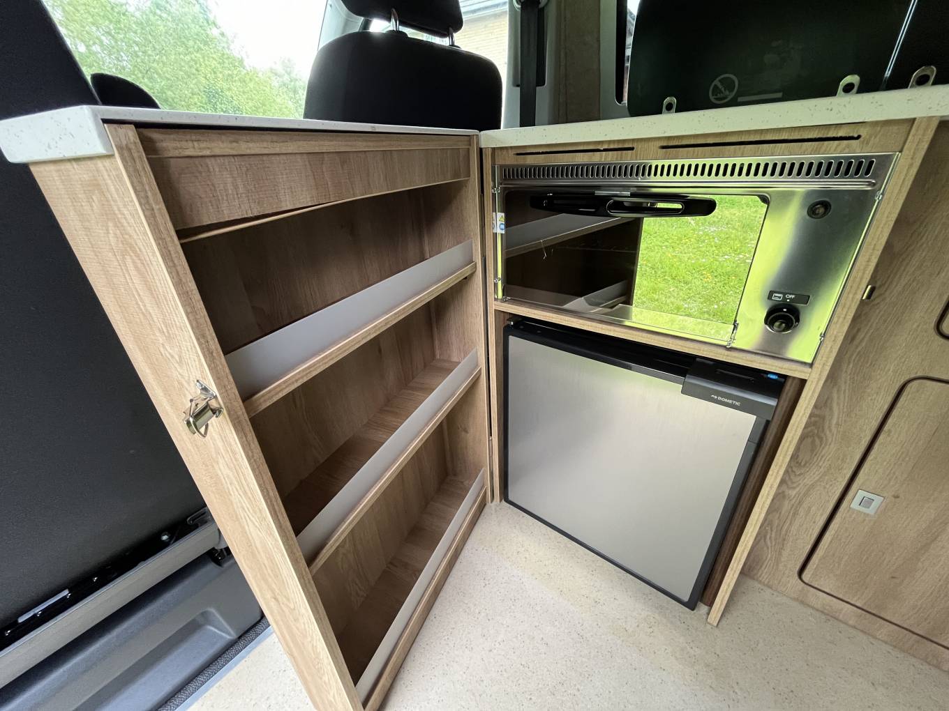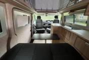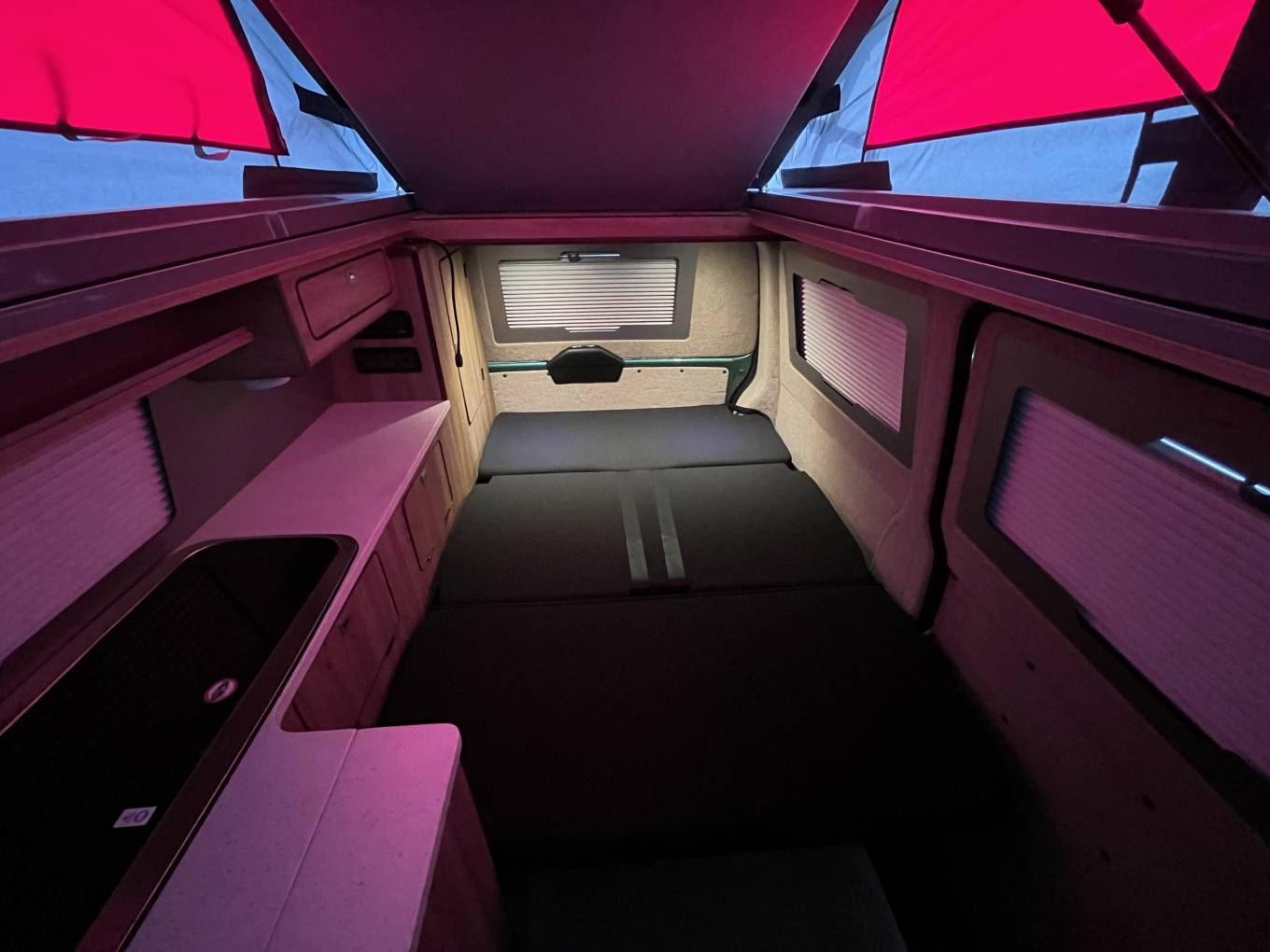 The campervan’s sleek and compact exterior allows for easy maneuverability, whether navigating city streets or country roads. The elevating roof not only adds headroom inside but also maintains the van’s low profile when down.