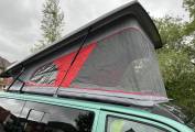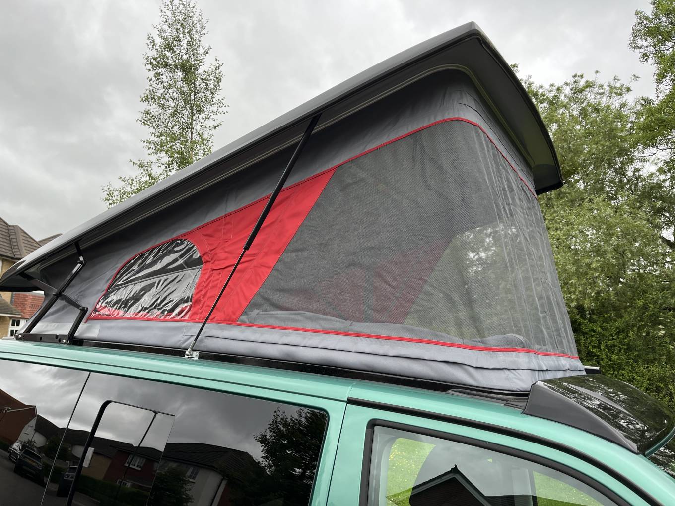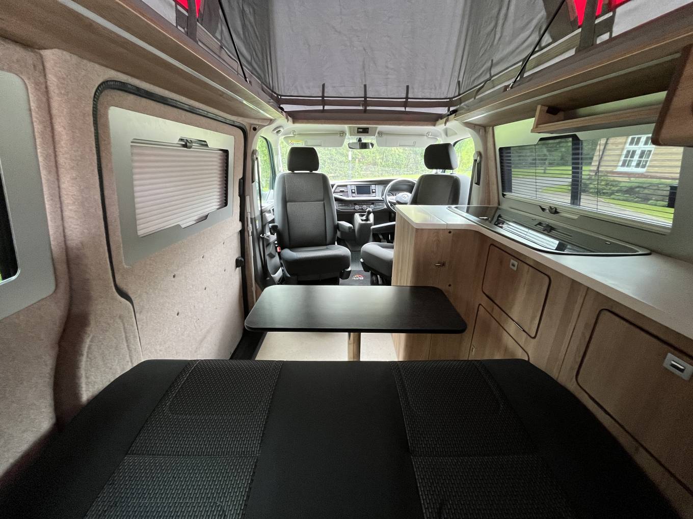 The campervan offers comfortable sleeping options for up to four people. The rear bench seat easily converts into a double bed, while the pop-top roof provides an additional sleeping area, ideal for children or extra guests.