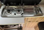 Equipped with essential amenities, the compact yet functional kitchen includes a two-burner gas hob, a sink with a glass lid, and a 50-liter fridge. There is ample storage space for kitchen essentials, ensuring you can prepare meals on the go.