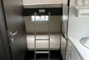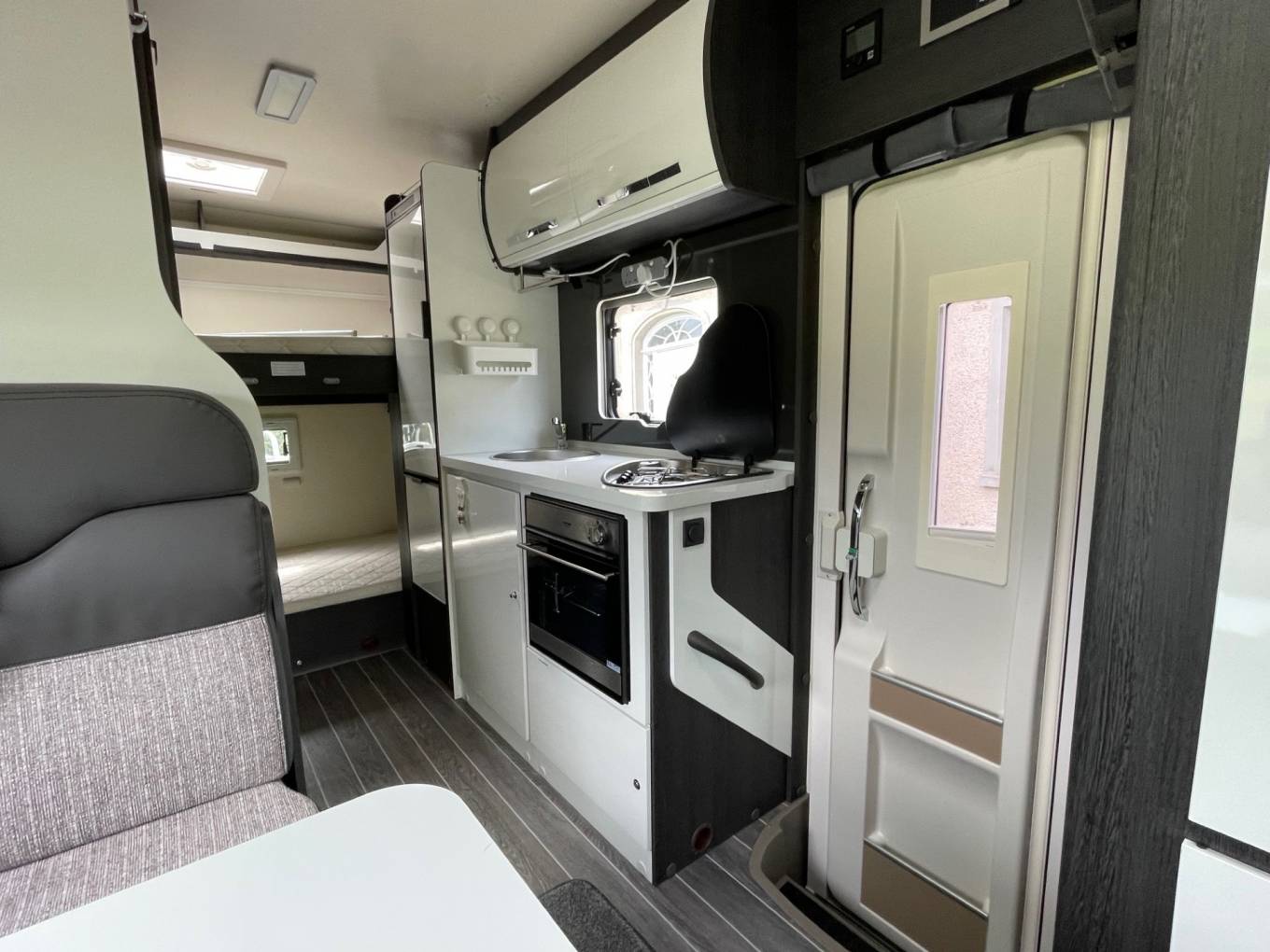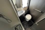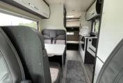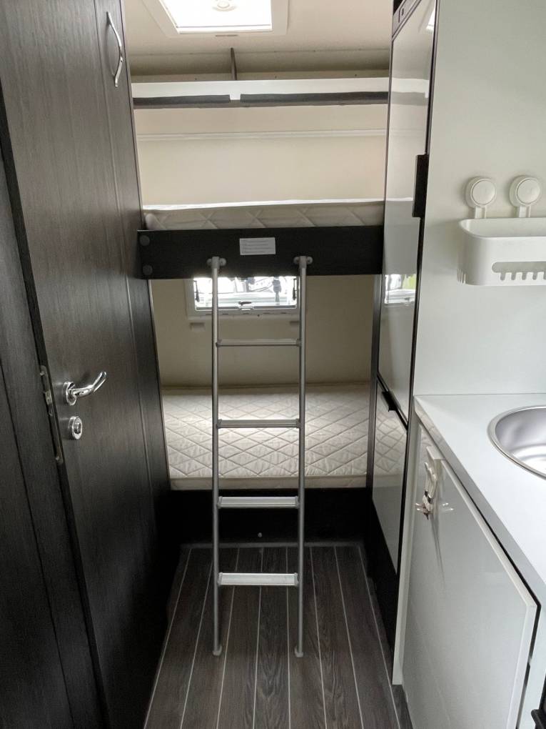 Washroom has a walk in shower, cassette toilet, wash hand basin and a vanity unit. Sleeping places for 6 people with 6 travelling seat belts. When travelling the bottom bunk can be lifted up to create a practical storage area and additionally this model could sleep an adult in this area. Dinette converts into a double bed and the last sleeping area is above the cab.