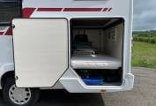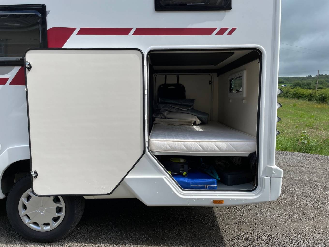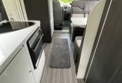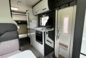 Kitchen is fully functional with a full sized cooker and oven, 3 way fridge freezer, sink with mixer taps and great storage in the lockers and wardrobe. Heating and hot water provided by the Truma system.
