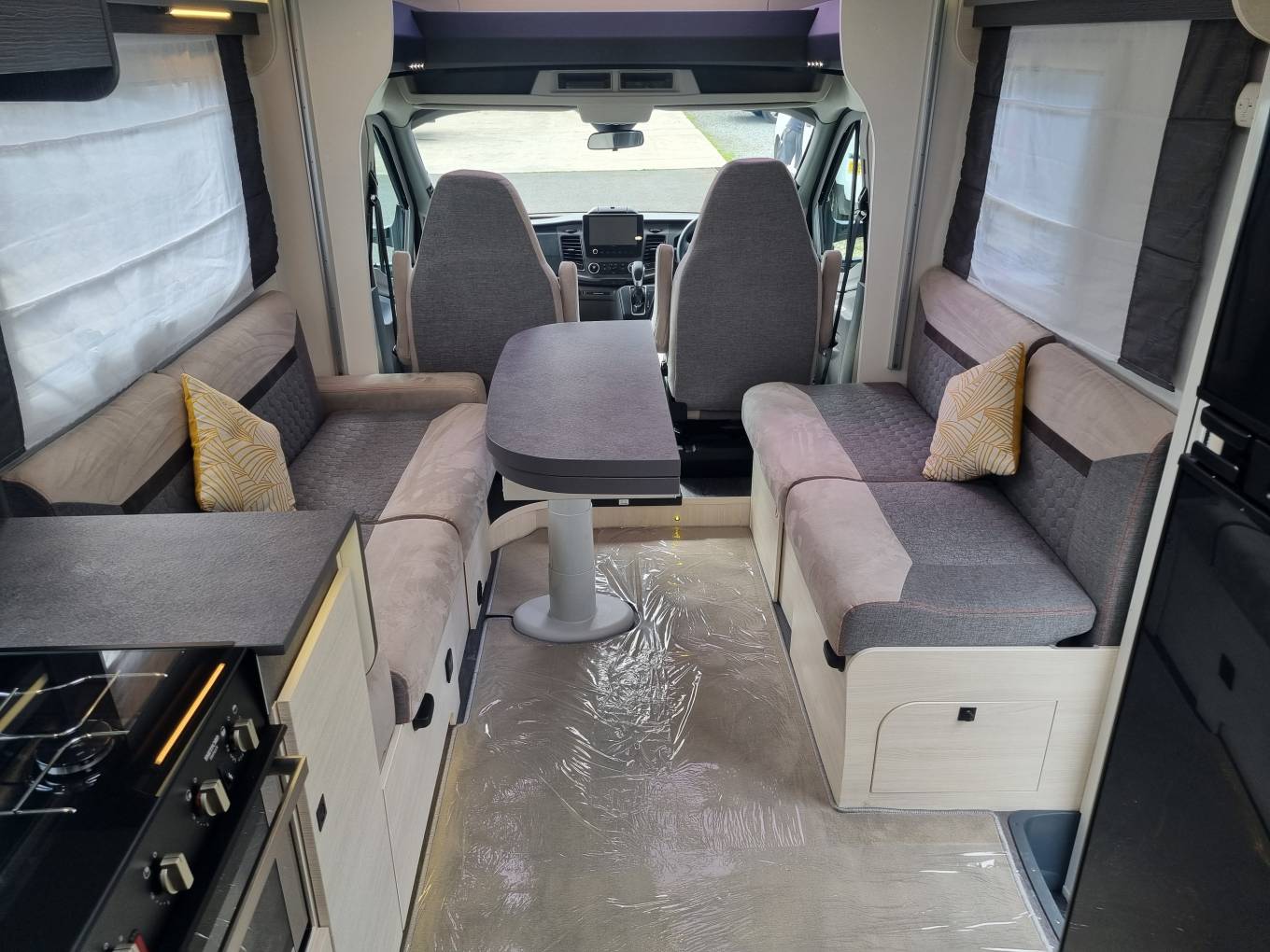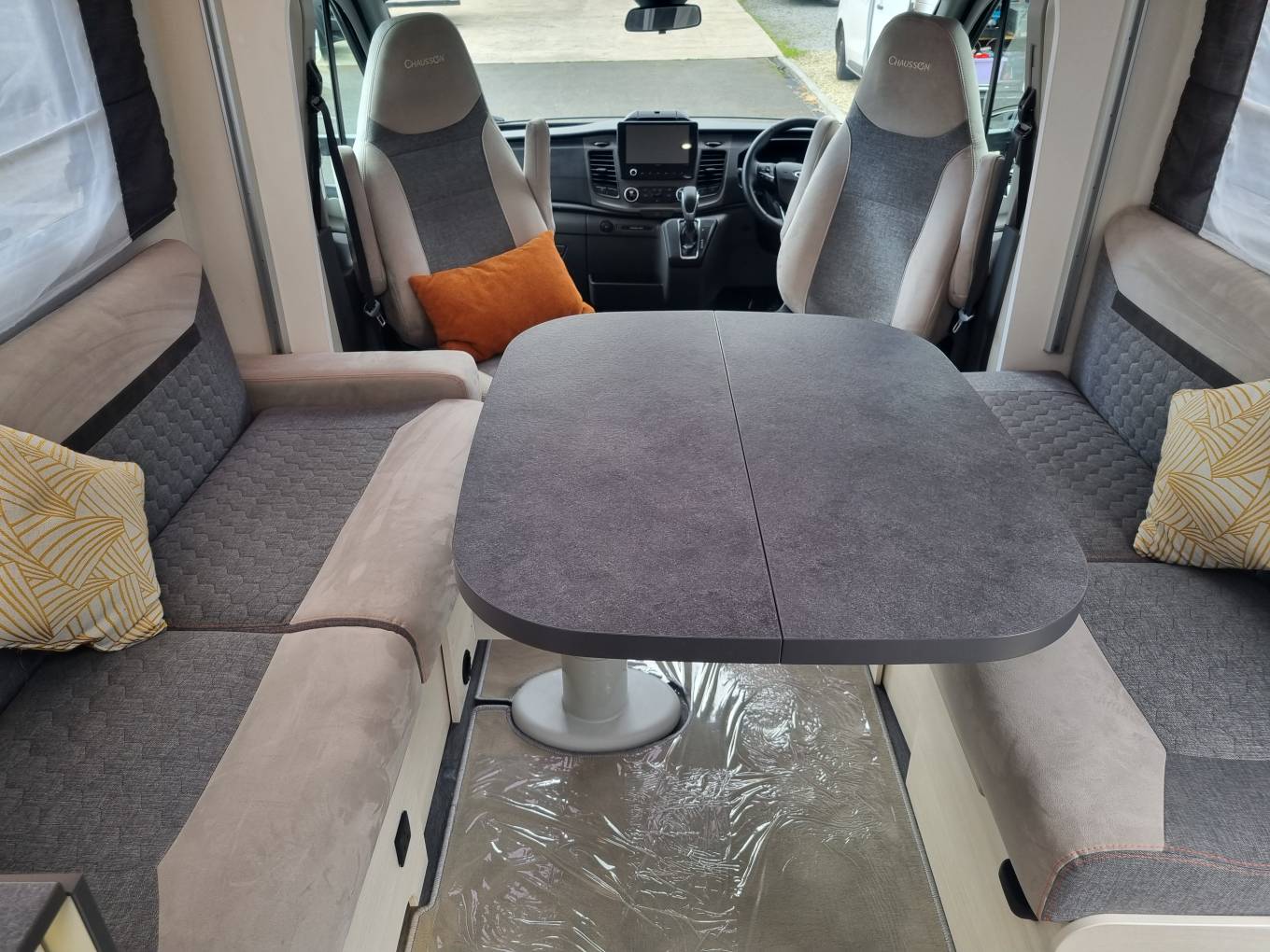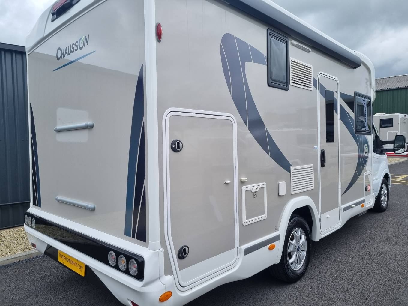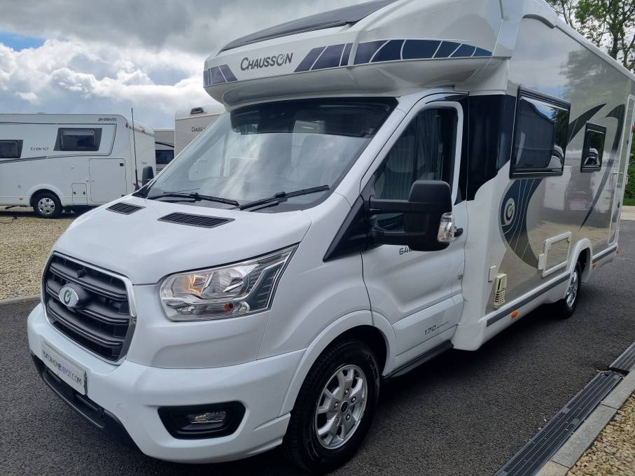 2022 Chausson 640 Titanium Premium Auto for sale. This beautifully presented motorhome boasts a huge specification with low mileage from one owner. The Chausson 640 model has a unique layout with a spacious smart lounge featuring twin swivel chairs, 2 x opposing sofas, 2 x hide away travel seats with 3 point seat belts and a double drop down bed for 2 persons. The lounge area can also be transformed into a double bed. A mid ship kitchen is well equipped with hob, oven, grill and large fridge freezer, and leads into a rear washroom with separate shower and large wardrobe. The rear garage has double door access and can also be accessed from inside the motorhome. Other defining features include Ford 3500kg chassis with an upgraded 170hp engine and automatic transmission, (standard car license only req) colour coded cab, alloy wheels, reverse camera, solar panel, awning, aerial, integral motorhome WIFI system, cab air con, cruise control, DAB radio, cab blinds, on the road heating, USB points, TV bracket, outside gas point, outside shower point and much more. Ford mechanical service has just been completed and habitation inspection is up to date. One years warranty included with this sale. Finance and part exchange available. Please call for further details.