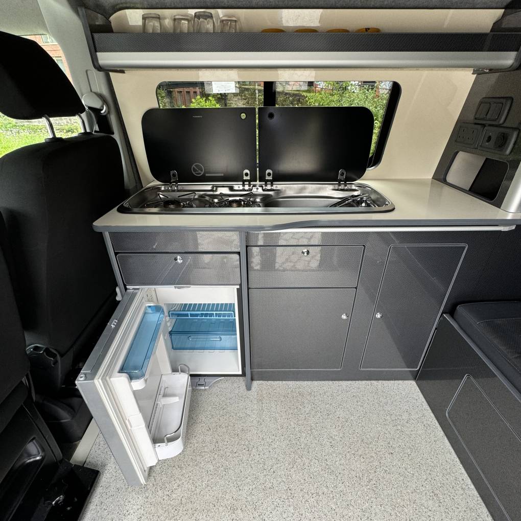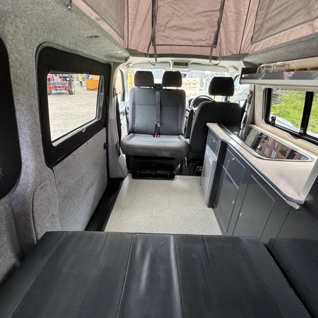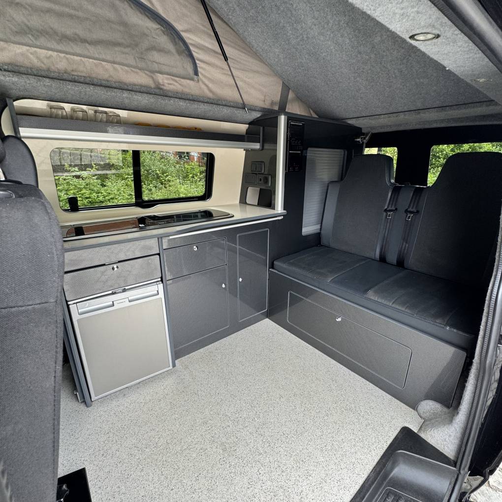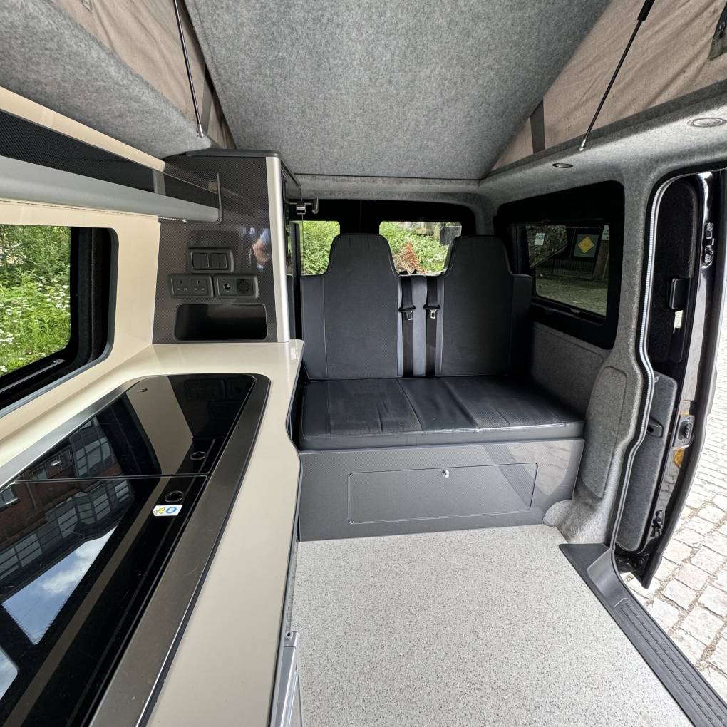 The conversion has been done to a high standard by HV Camper Conversions with the following spec: Austops pop top roof with mattress, Fully insulated with sound deadening (Grey Carpeting with removable panels), 4 Touch sensitive down-lighters, Bespoke carbon effect kitchen with recessed cupboards with soft close hinges, 3 Stage Strip LED lighting with added LED light in wardrobe/cupboard, Full split charge 12 volt battery system with 12v/USB socket and 240v electrical hook up system, Dometic Power Management System, Dometic double HOB and Sink, Gas bottle included, ROCK and ROLL Bed with carbon effect kickboards to match kitchen, Swivel and pull out bench seat, Full surround black out blinds, Removable and adjustable Table, Sanjo fridge, Privacy glass windows, Vented gas locker.
