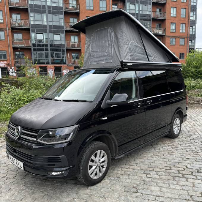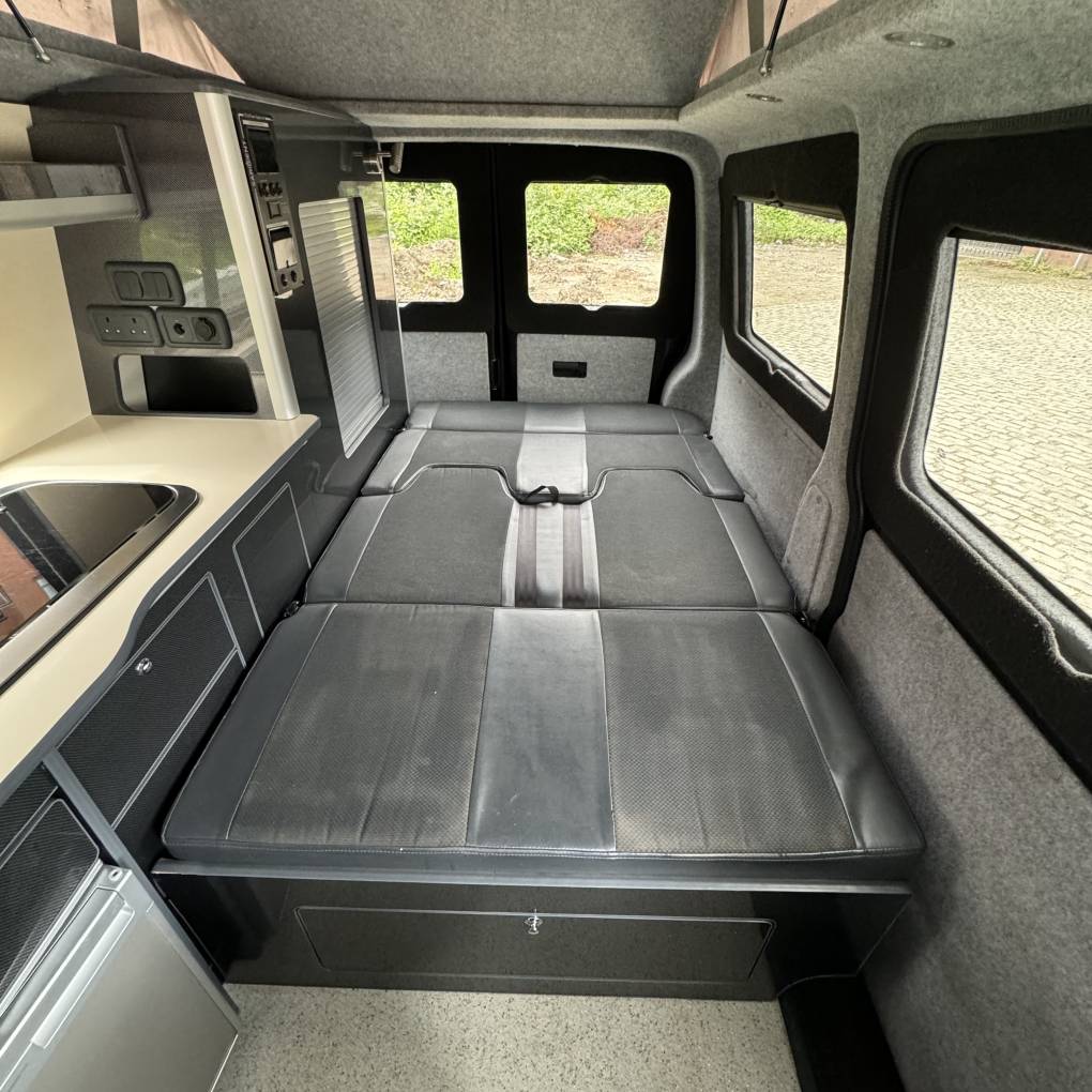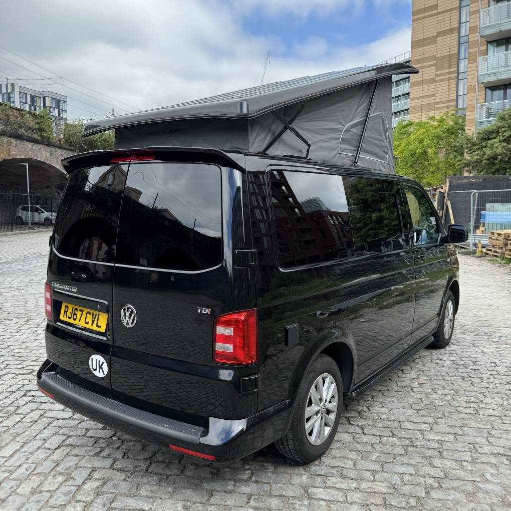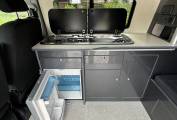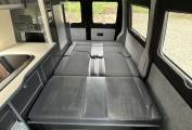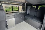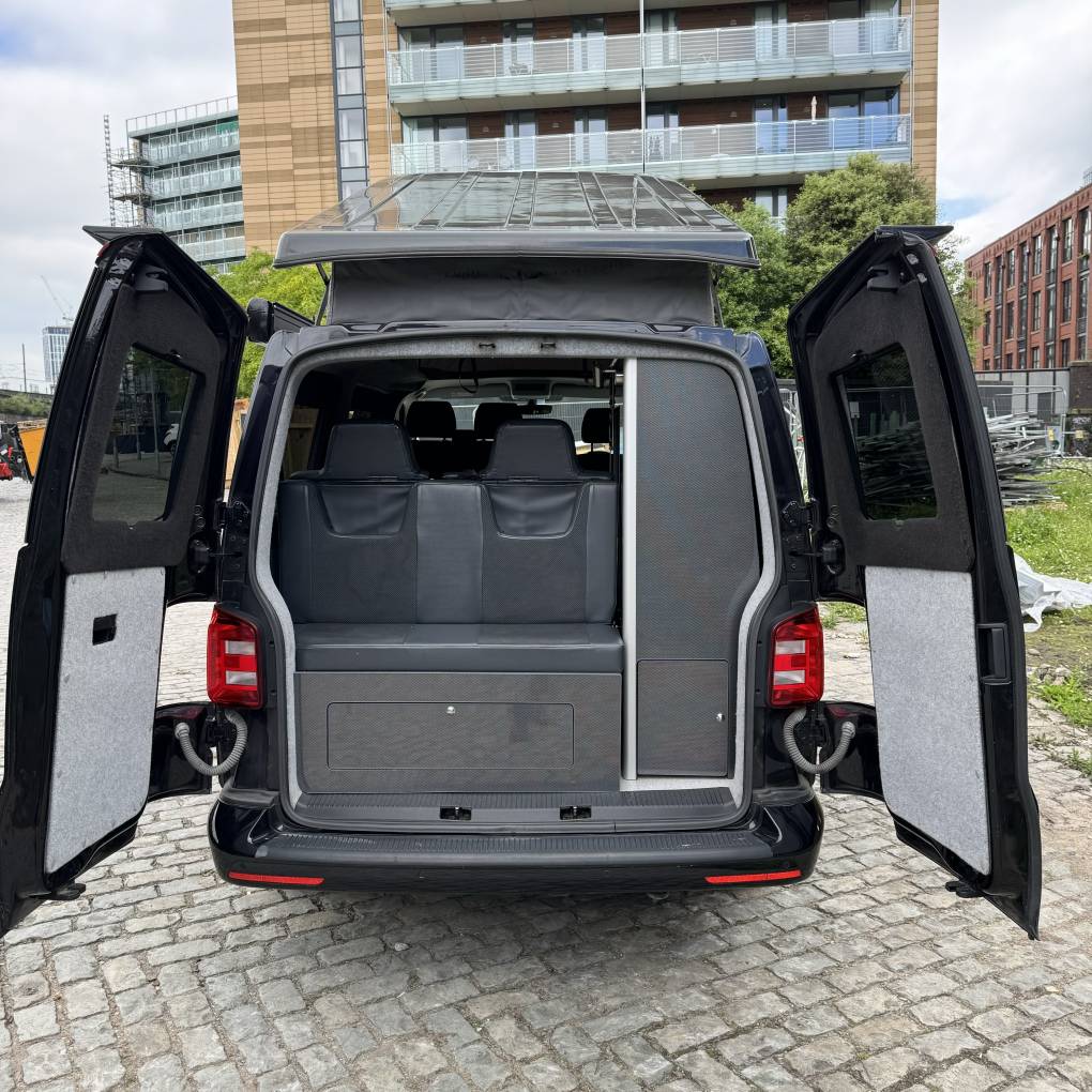 The conversion has been done to a high standard by HV Camper Conversions with the following spec: Austops pop top roof with mattress, Fully insulated with sound deadening (Grey Carpeting with removable panels), 4 Touch sensitive down-lighters, Bespoke carbon effect kitchen with recessed cupboards with soft close hinges, 3 Stage Strip LED lighting with added LED light in wardrobe/cupboard, Full split charge 12 volt battery system with 12v/USB socket and 240v electrical hook up system, Dometic Power Management System, Dometic double HOB and Sink, Gas bottle included, ROCK and ROLL Bed with carbon effect kickboards to match kitchen, Swivel and pull out bench seat, Full surround black out blinds, Removable and adjustable Table, Sanjo fridge, Privacy glass windows, Vented gas locker.