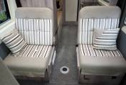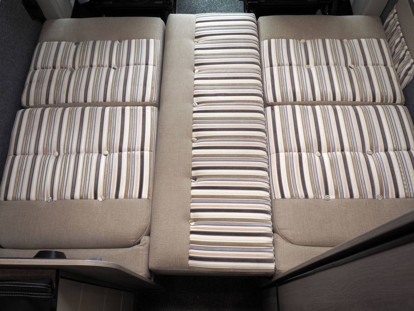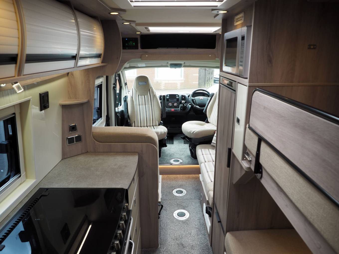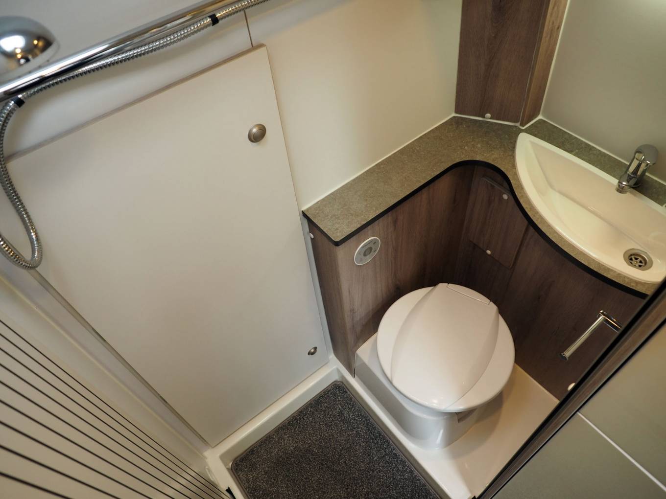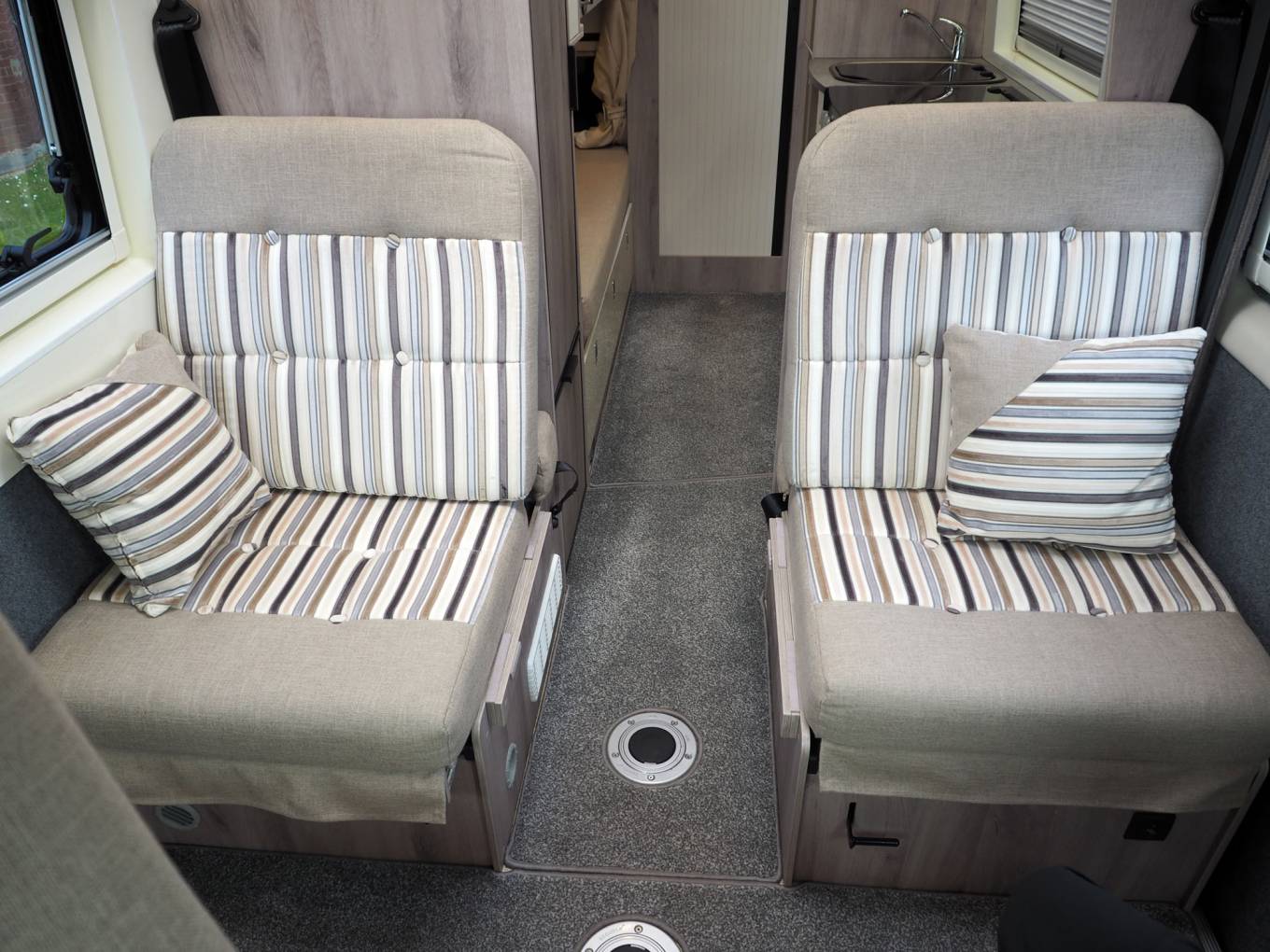 Onboard domestic facilities include 100 litre fresh and waste water tanks, 30 litre domestic LPG tank, Truma dual fuel heating and hot water, full electrics with charging system and solar panel. Fit and finish are to a very high standard throughout, with many fine details. Up front the cab is well equipped with reversing camera and sensors, cruise control, cab air conditioning and integrated night blinds. The 138bhp engine powering through a six speed gearbox makes for easy driving with light controls. Outside, there is a full length roll out sun canopy, LPG filling point, rear door access to toilet cassette and additional storage.