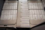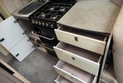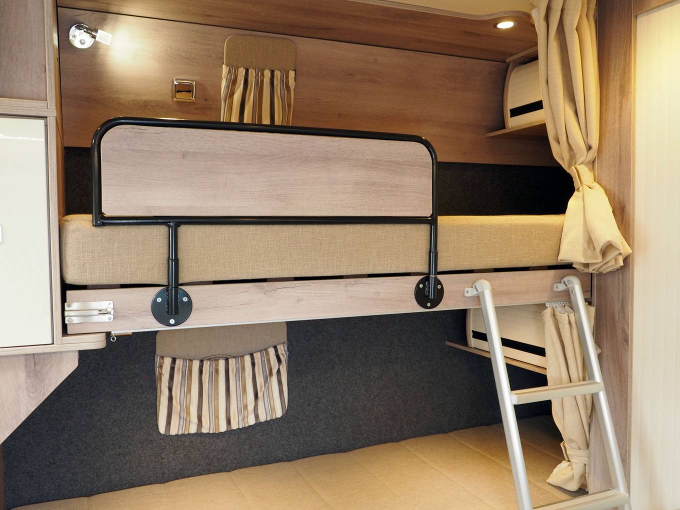 With the two cab seats swivelled there is plenty of room for four in the dinette, with the option of making a side settee, or two forward facing rear seats, opposing a choice of pedastal table positions. The midships kitchen is compreshensively equipped including large fridge freezer, gas hob, oven and grill, microwave, plus excellent storage and workspace for this size of vehicle. The rear corner washroom features toilet, shower and vanity sink, neat storage and lighting. The side bunks are well thought out, each with its own lighting and storage, both substantial and suitable for adults, the upper one can be hinged up for more space if required, while the lower bunk has a range of drawer storage underneath.