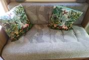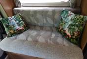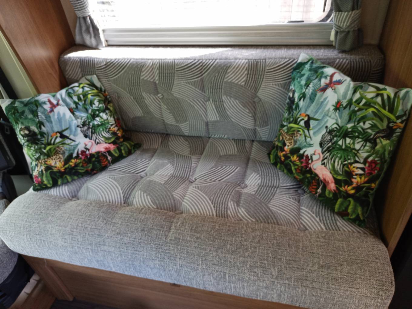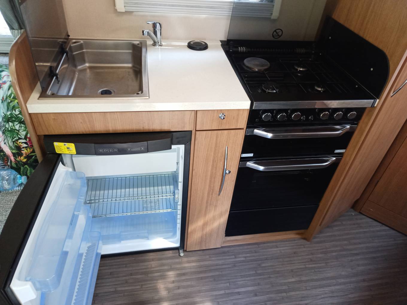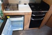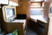 Entering through the nearside habitation door, you have the spacious lounge and dining section with 2 long opposing sofas, and the cab seats which when swivelled give a social space for up to eight persons. The cab and hab' seats are in grey oatmeal patterns with no markings whatsoever. The fully featured kitchen offers a three and one gas and electric hob, and underneath a grill and separate oven. An automatic three-way under-counter fridge is spotless and located below the recessed sink and adjacent work surface. A microwave oven completes the kitchen offering.