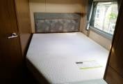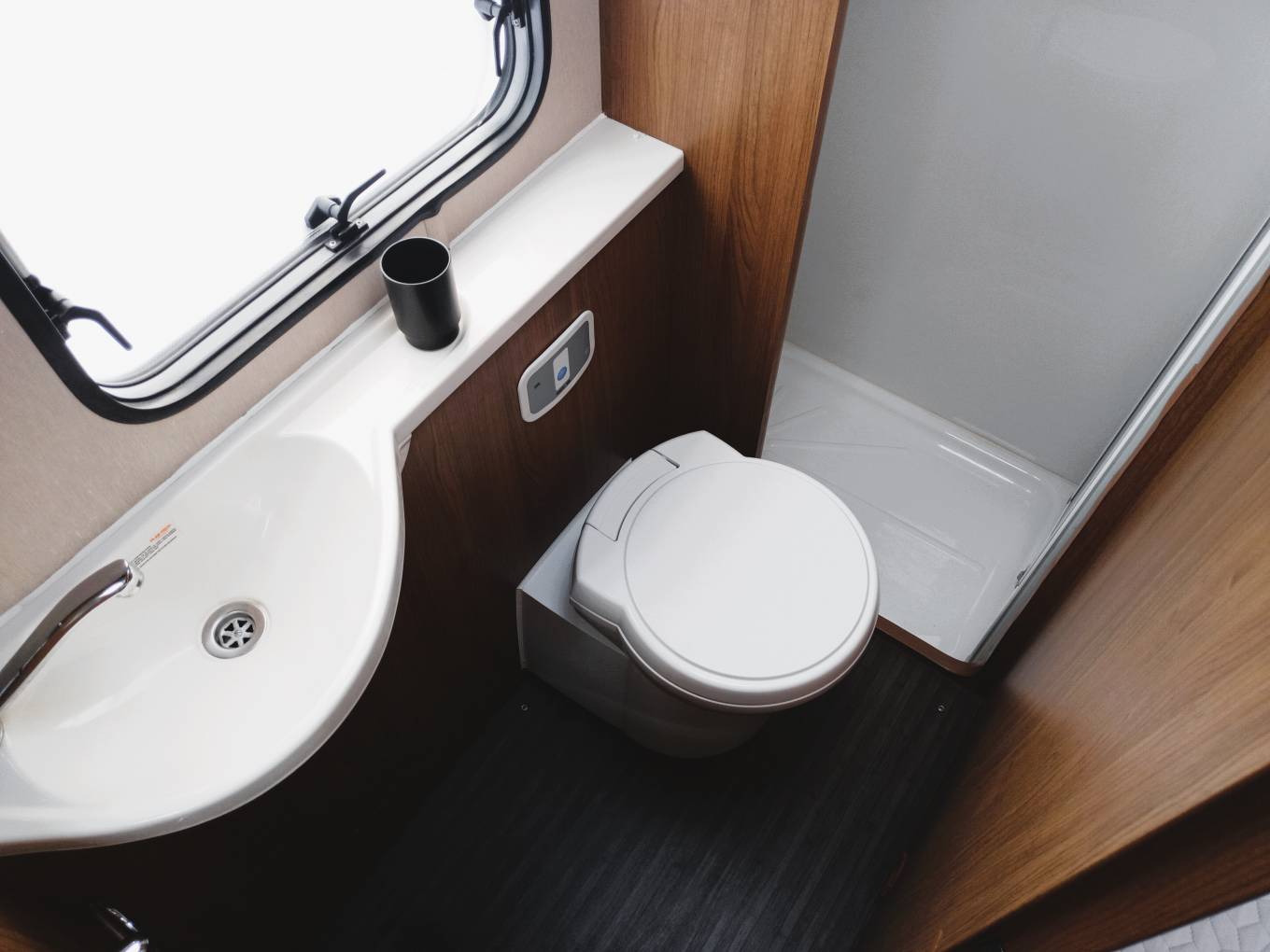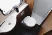 To the rear nearside of the motorhome you find the fixed double bed, with an as new mattress, reading lights and the adjacent washroom with a separate shower cubicle, wash basin and loo, again in tip-top condition.
