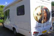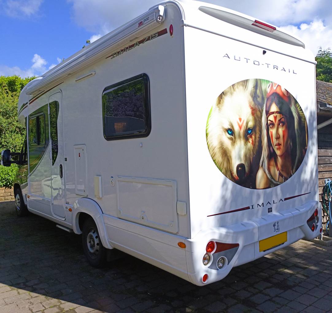 The striking graphic on the rear of the motorhome was on the vehicle when the present owner purchased it, but it can be removed- the owner kept it as it stands out and is arguably a disincentive to thieves as it makes it very noticeable.