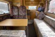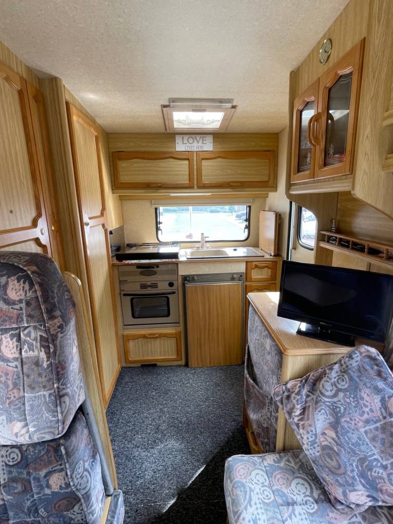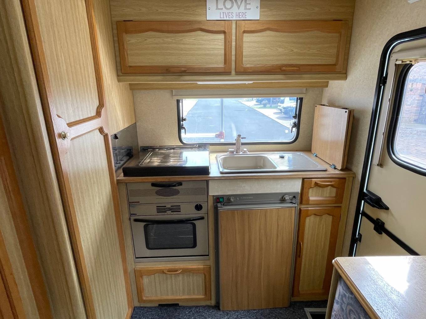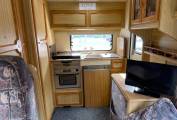 At the rear your kitchen has a 3 way fridge freezer, oven, grill, 3 burner gas hob and a sink with mixer taps. Bathroom has a shower, cassette toilet and a wash hand basin.
