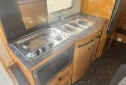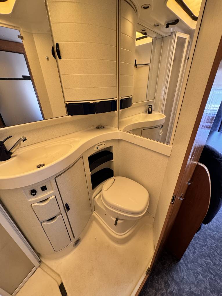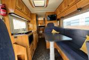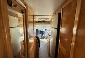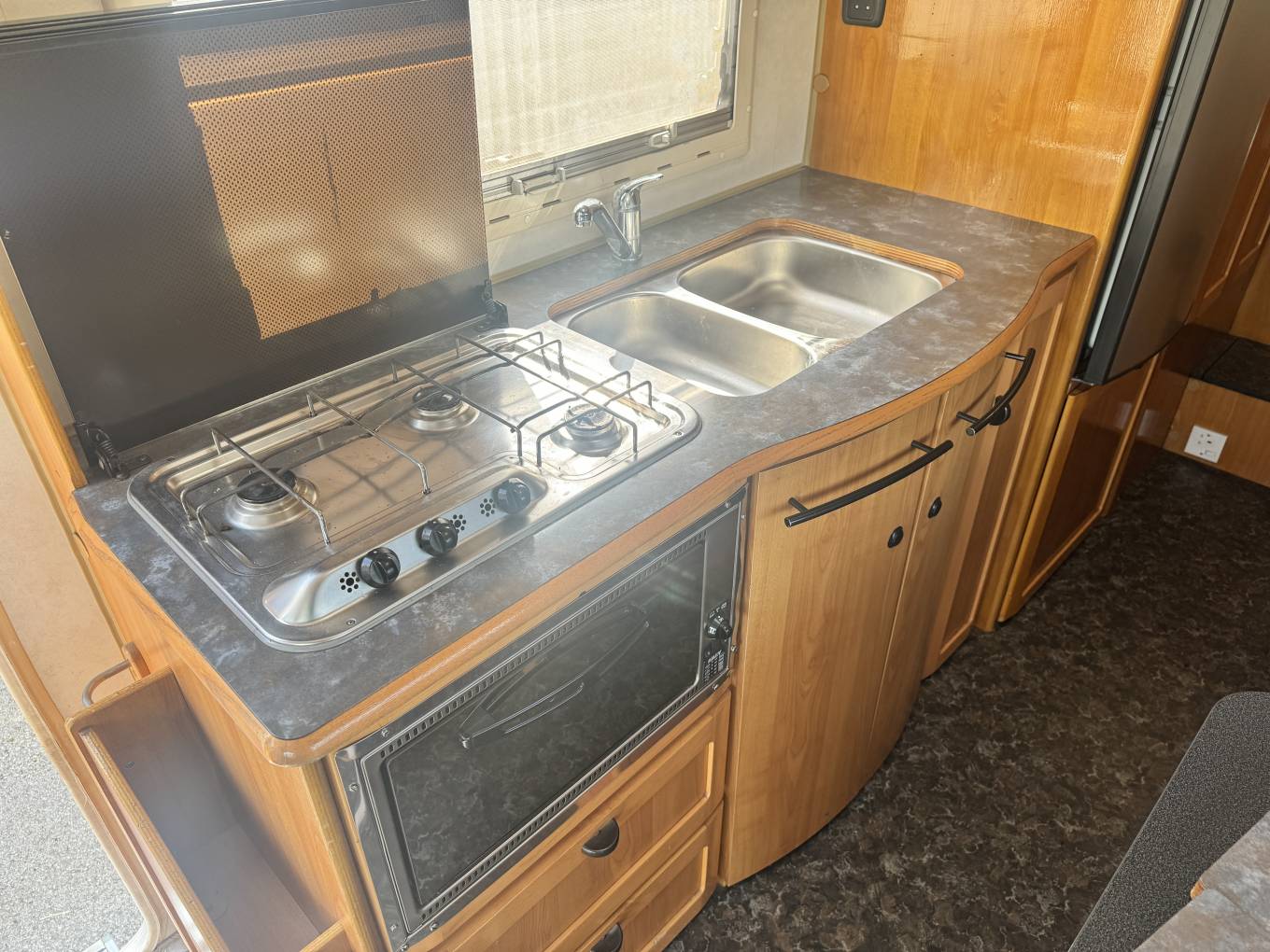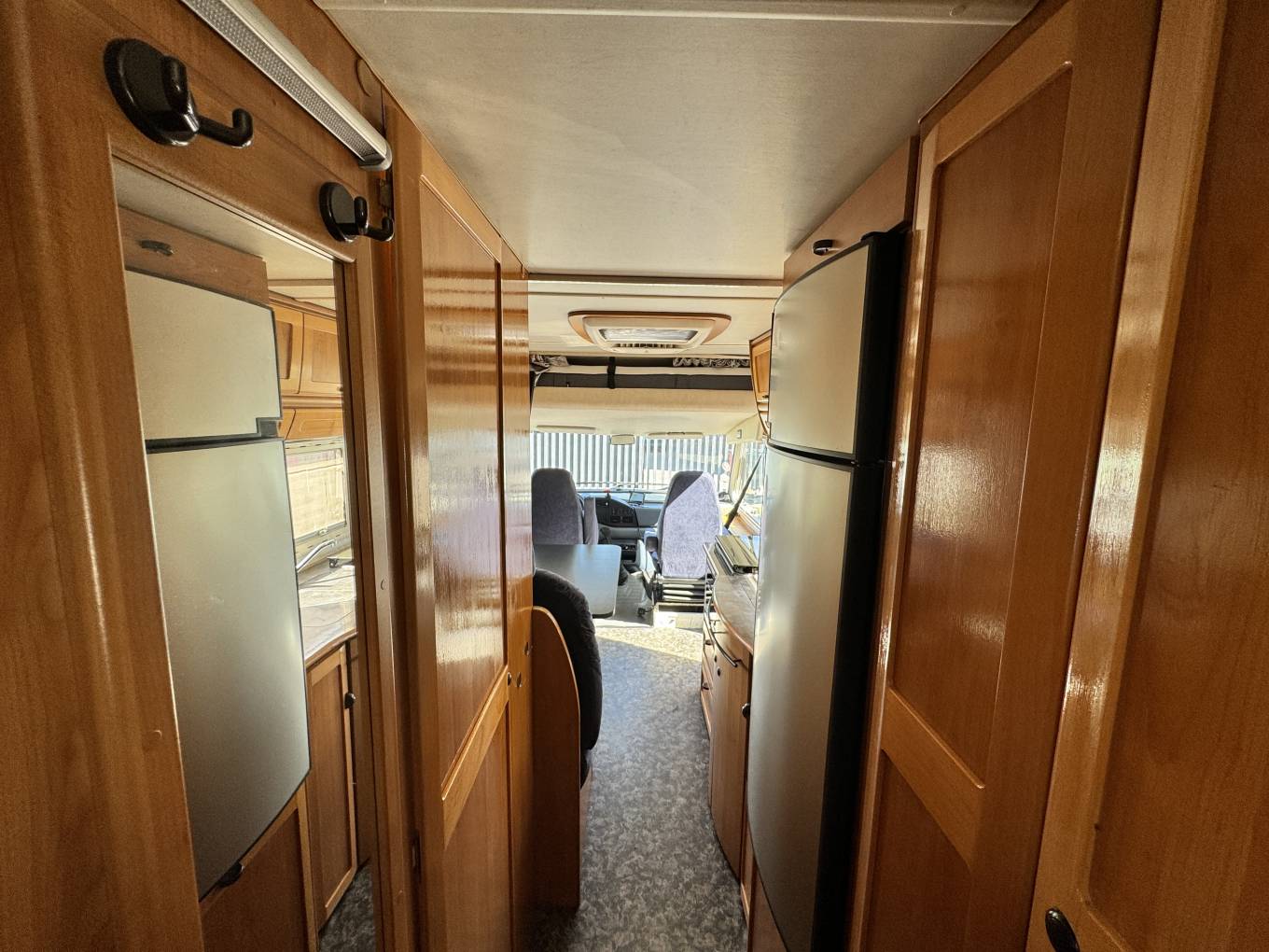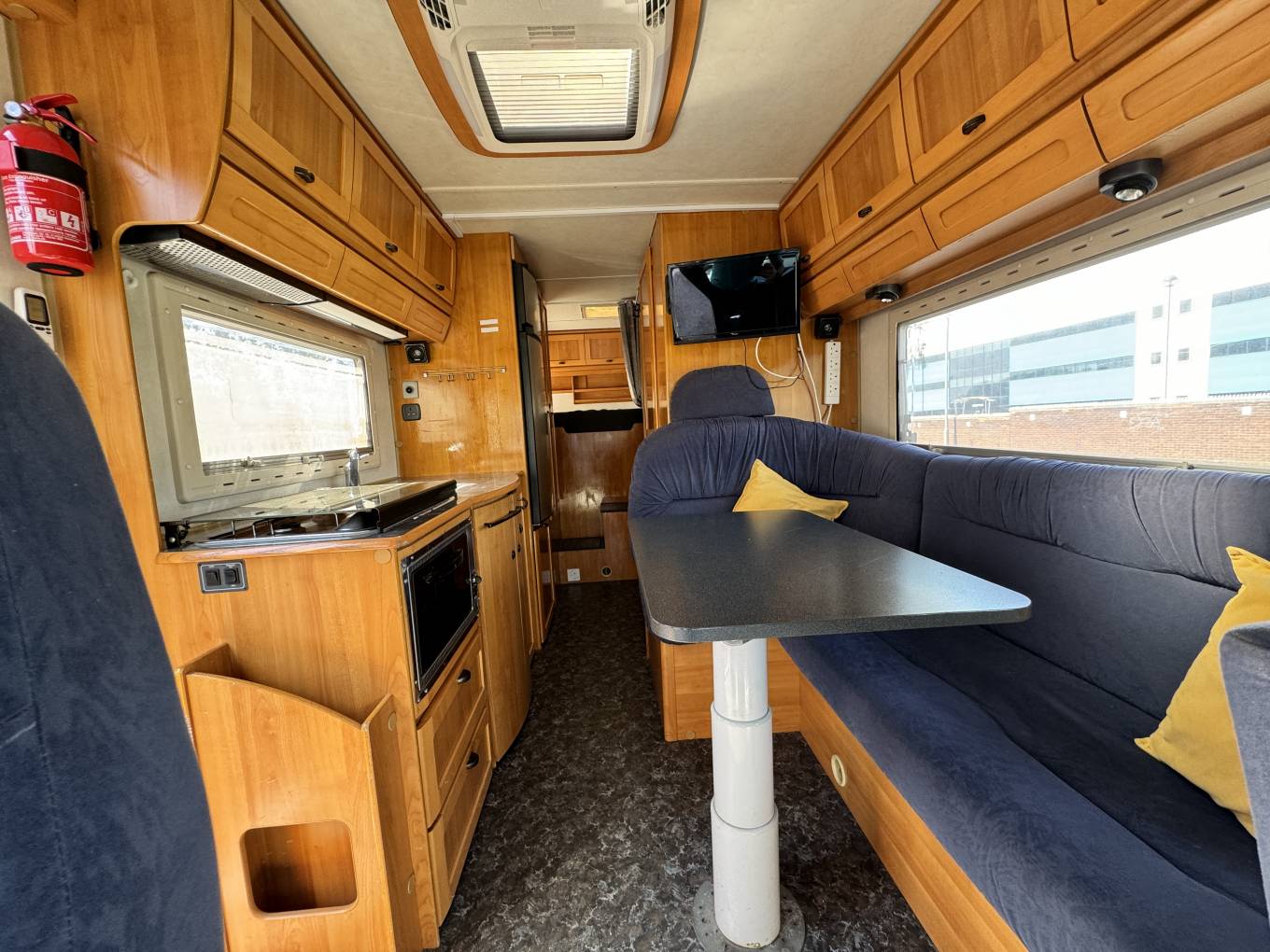 The dinette is spacious and comfortable for 4 people and is directly behind the 2 swivel captains chairs in the cab. Behind this area is the spacious washroom with separate shower and toilet with vanity unit. The kitchen opposite boasts a 3 burner hob, sink and oven/grill with a recently replaced Dometic fridge bringing a touch of modern to the motorhome. The large fixed rear transverse bed is situated above a huge garage capable of housing bikes and more.