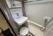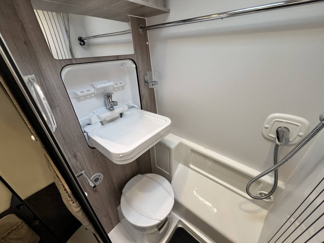 Rear of the wardrobe is the bathroom where you will find a Dometic Flush cassette toilet, a tip up Wash Handbasin and a Shower.