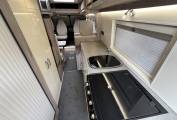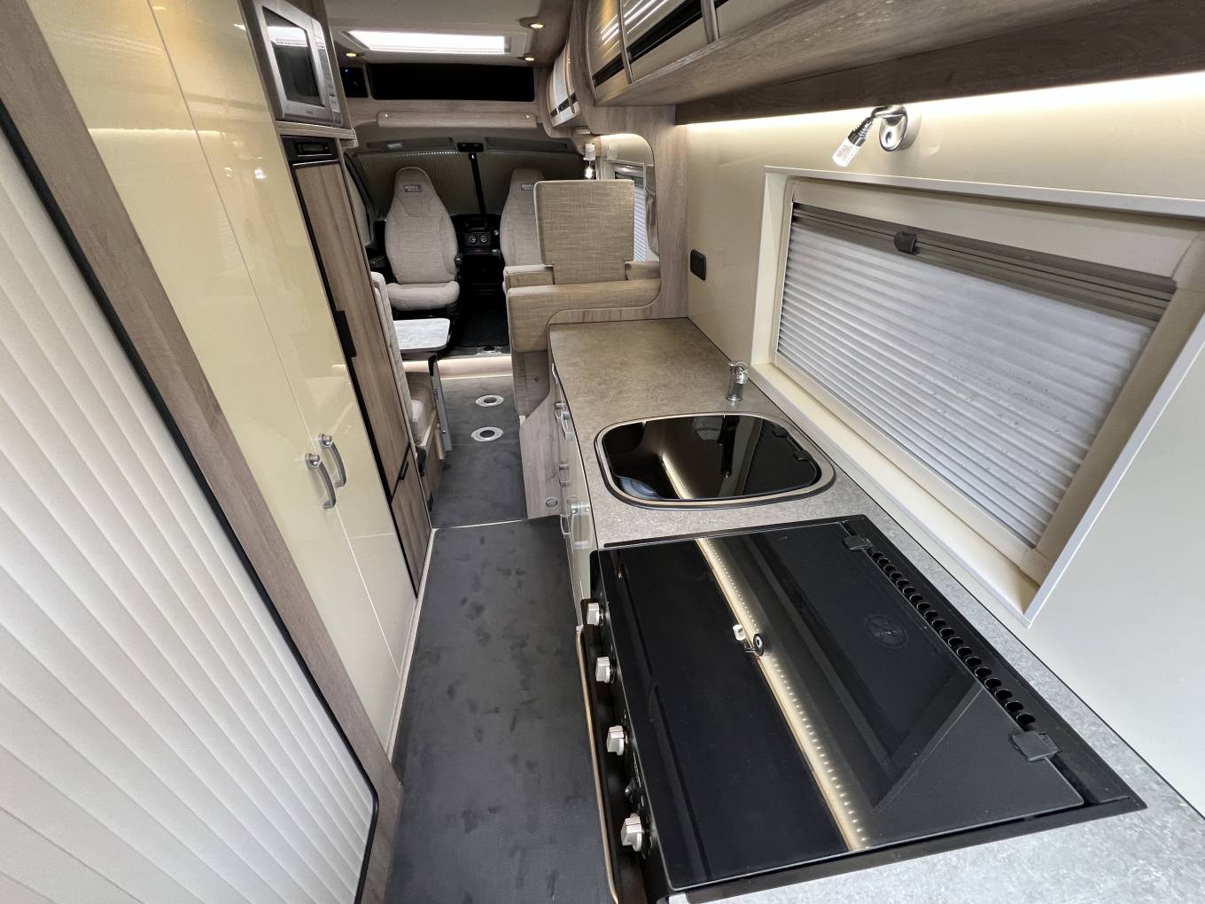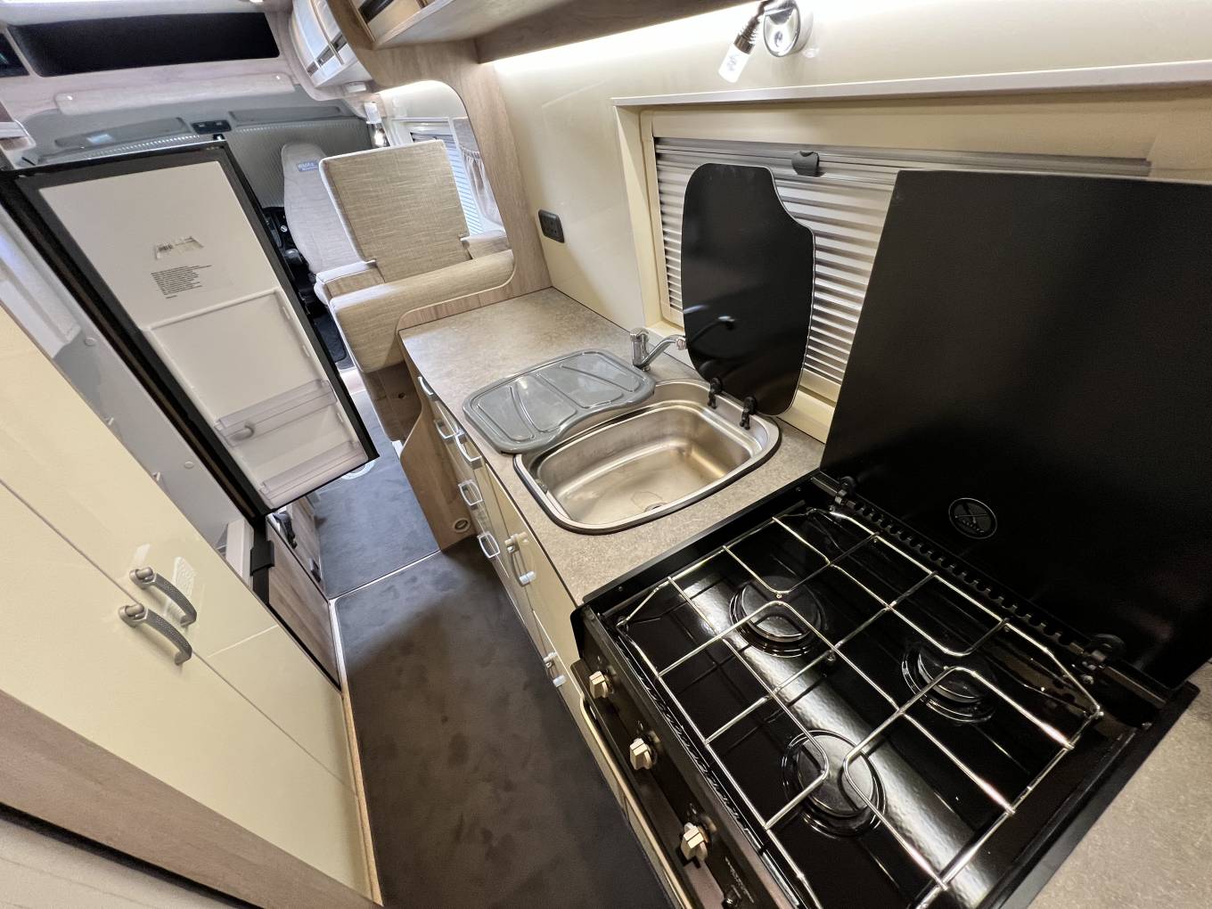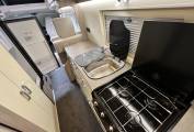 Along the offside back from the belted seat is a huge kitchen worktop containing a sink with a hot and cold mixer tap and removable drainer, a Three Gas Burner Hob, an Oven Grill combination and a ridiculous amount of cupboards and drawers.