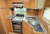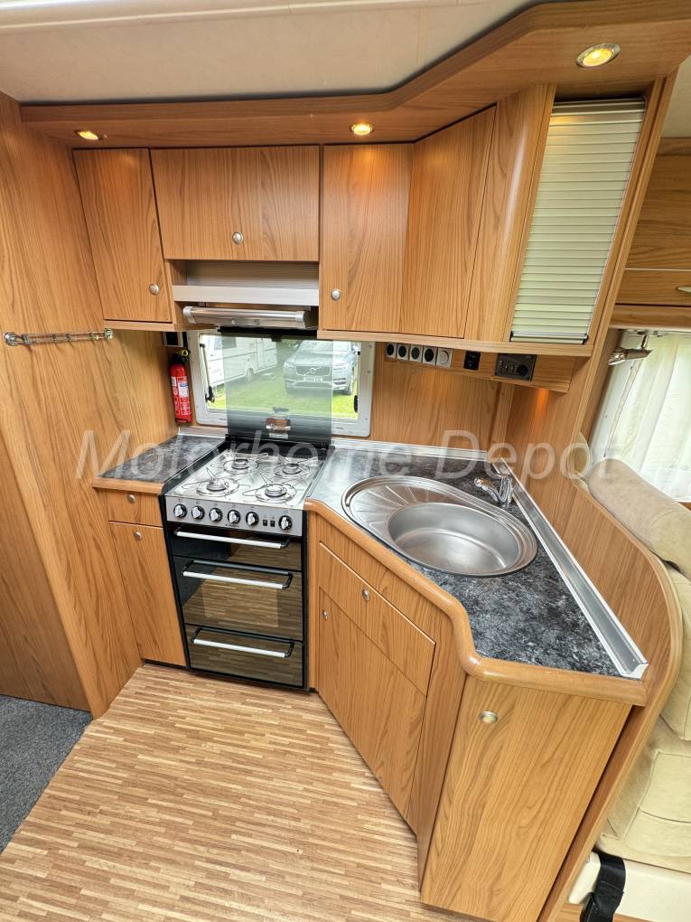 Moving rear is the L shaped kitchen which is spacious it has a brushed metal sink & drainer with chrome mixer tap, full sized oven & grill with 4 gas burner hob & extractor above. Opposite is a large Dometic fridge with separate freezer compartment, this will run on 240v; 12v or gas depending whether you are plugged in on site or wild camping. Above a microwave oven has been fitted for use on site. There is ample drawer & cupboard space for all your holiday provisions & kitchen utensils.