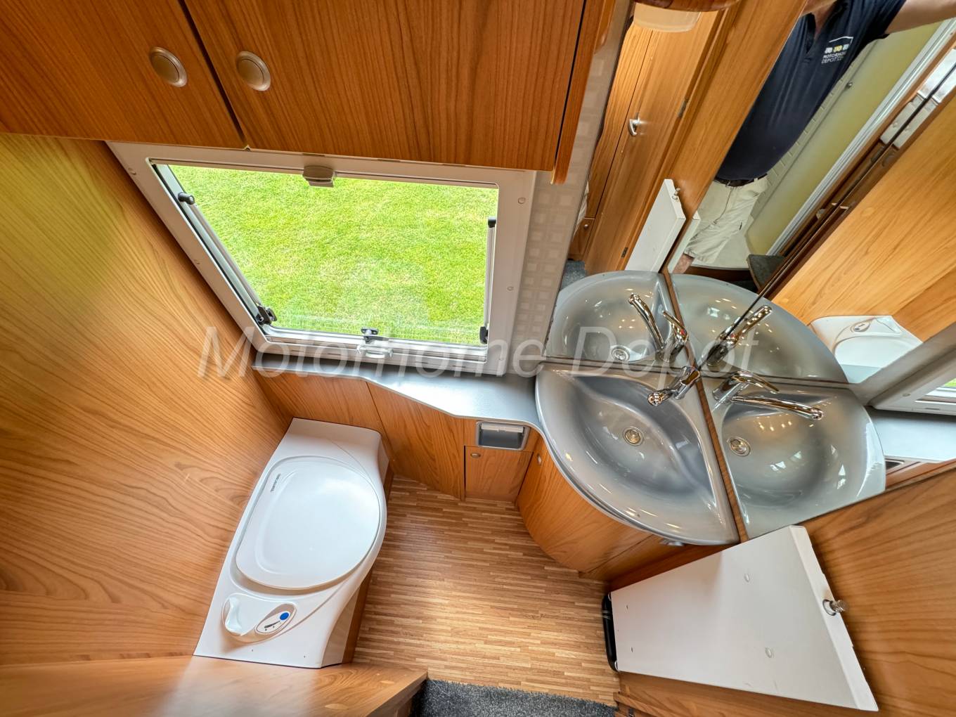 Moving rear again is the bathroom area which can be completely closed off from the front with the use of the toilet door, this gives a private area to dress in the morning. The washroom is on the passenger side with a Thetford electric fresh water flush cassette style toilet, a large corner sink to the right with a chrome mixer tap. On the opposite side is the separate shower cubicle with Perspex doors to close & a large hanging wardrobe which incorporates: TV aerial & booster; Wi-Fi Router & Alde expansion tank.