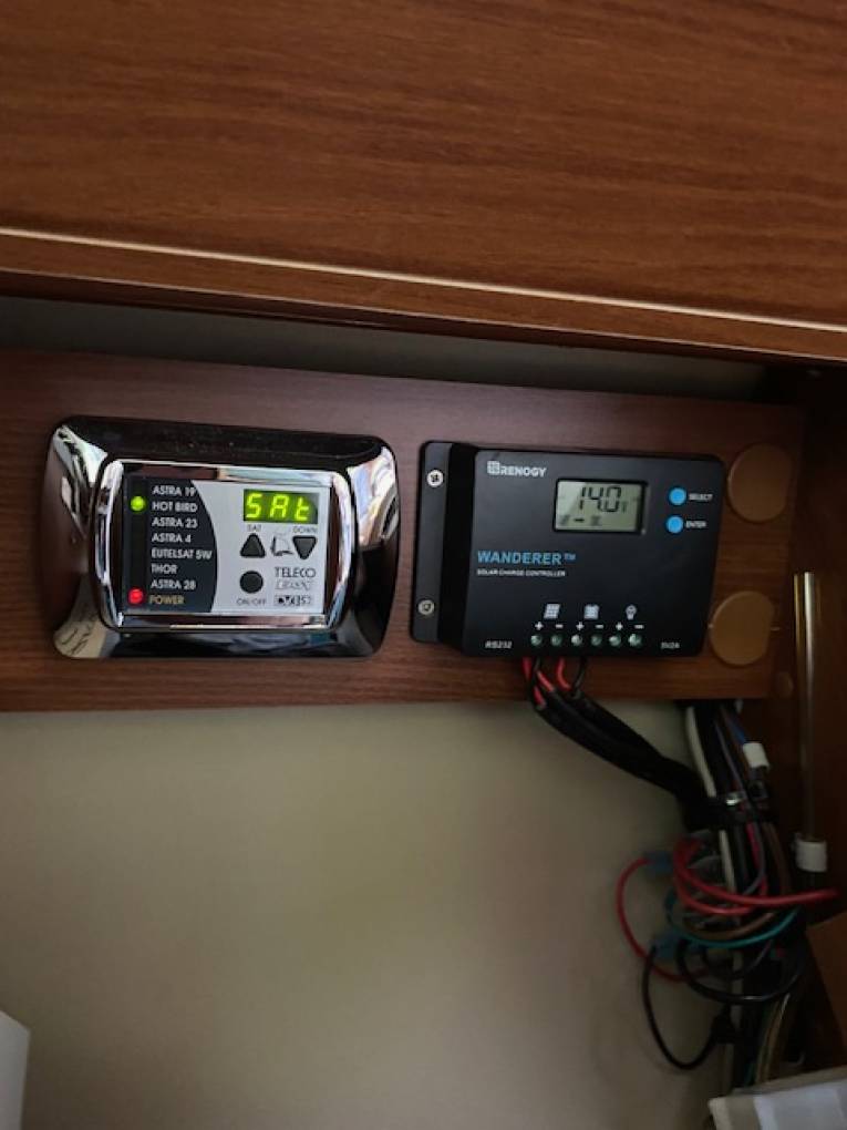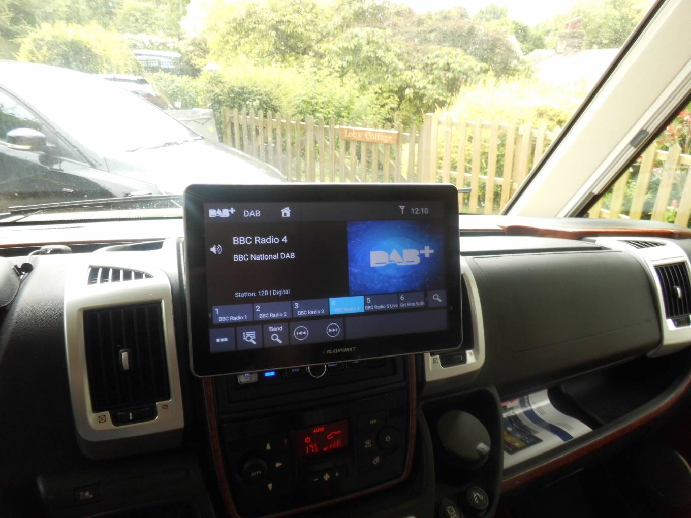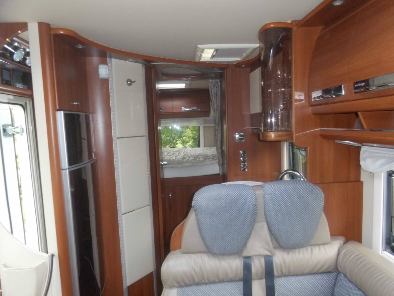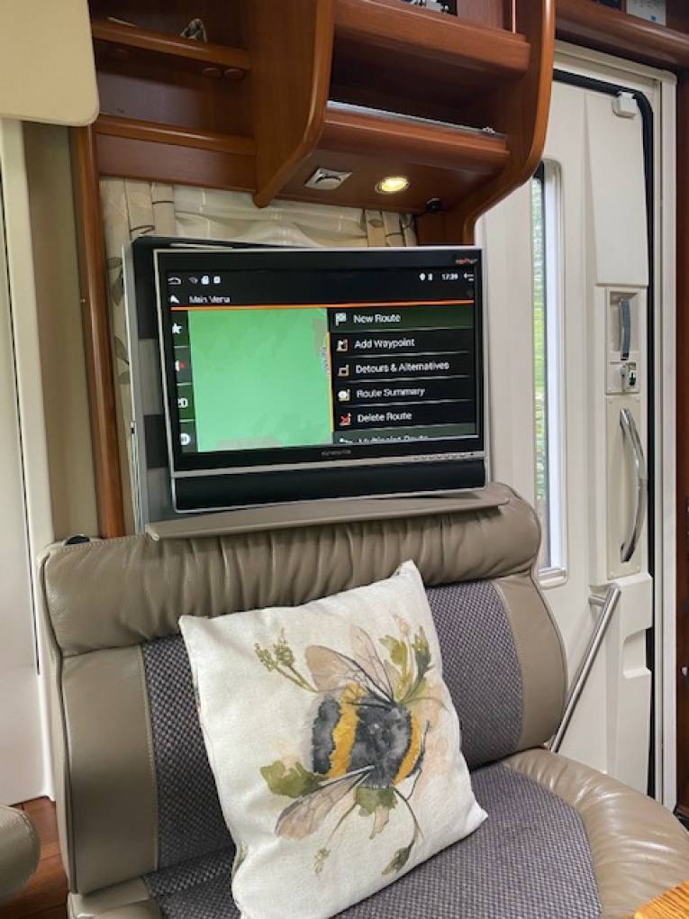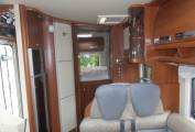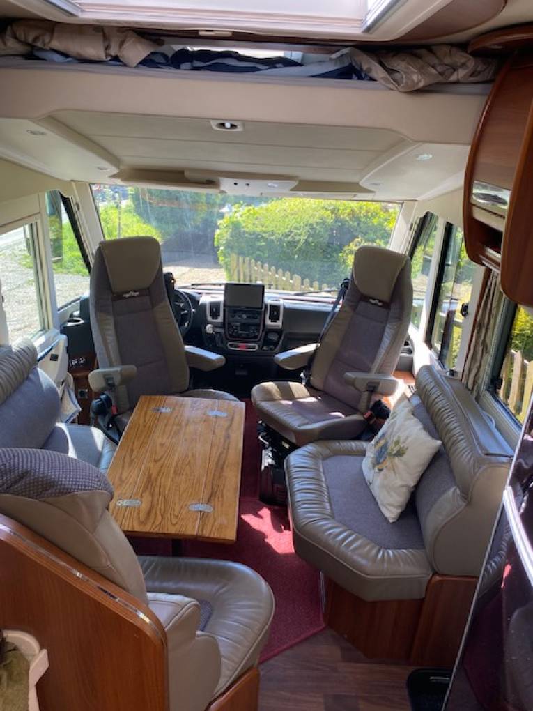 The Lounge and Front Captains Seats are finished in soft cream leather which looks as good as New. There is an L Shape Sofa with two Forward Facing Seat Belts, plus a Side Sofa that has a Fold Away Pop Up TV Stored behind it. The two front seats swivel to become part of the Spacious Lounge and Dining area.