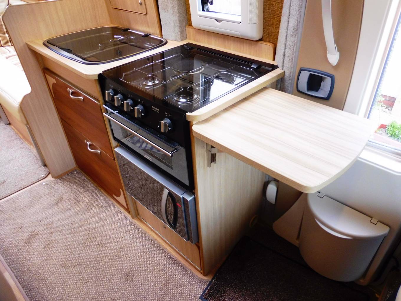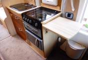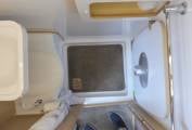 The mid-ships kitchen is well-equipped with dual-fuel hob and electric combi oven-microwave, gas grill, sink with drainer, Dometic fridge freezer and extending worktop. Everything you might need for a light snack or full evening meal. A well-lit compact washroom sits opposite.