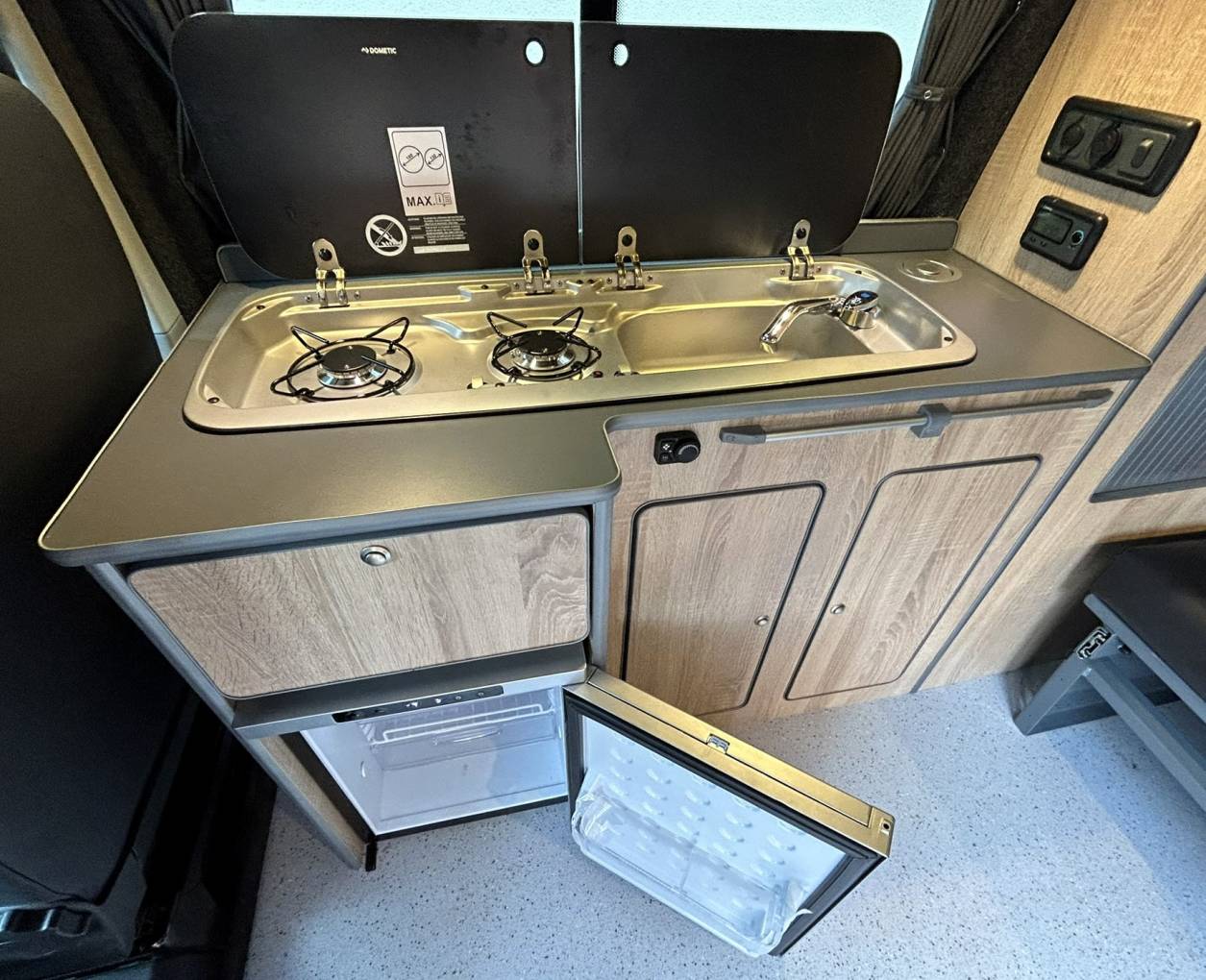 of the camper consists of a Vulcan Swivel King passenger seat, a Vulcan Rock & Roll