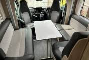 two front swivel cab seats, side bench seat and U-shape dinette together with a