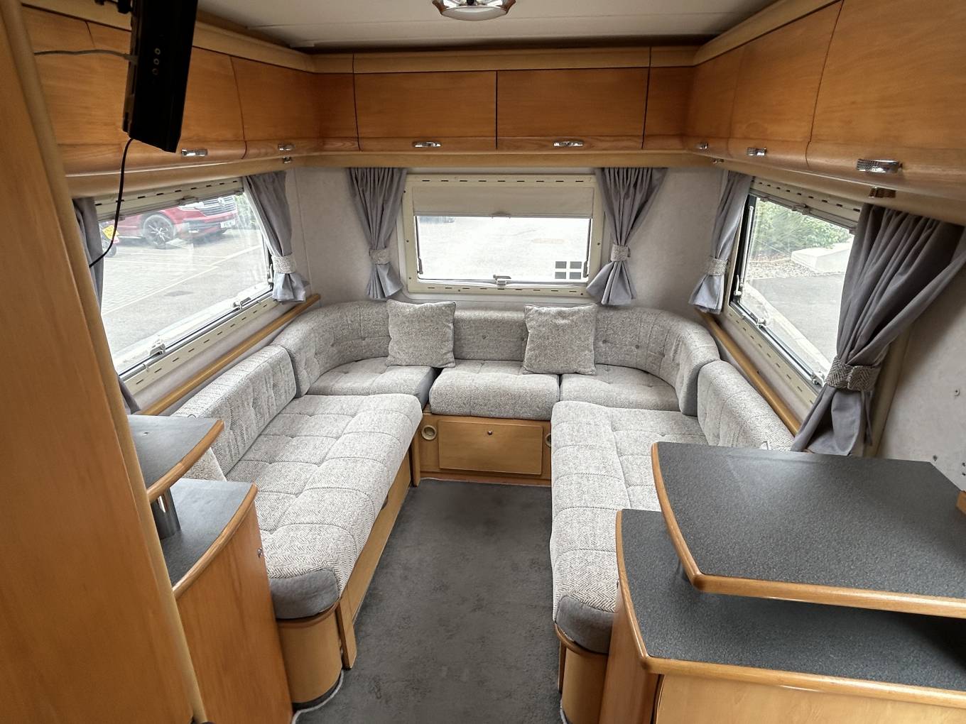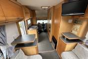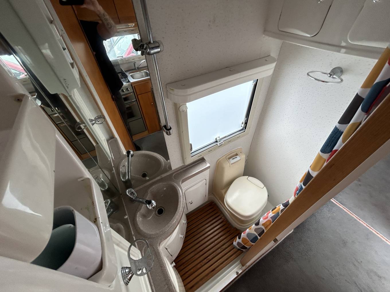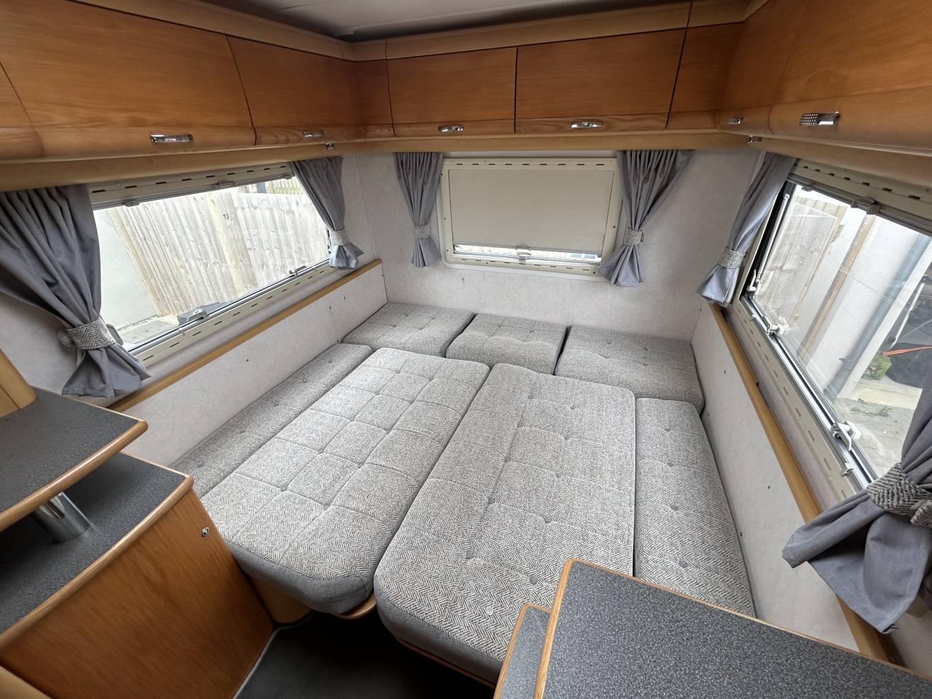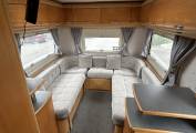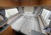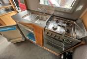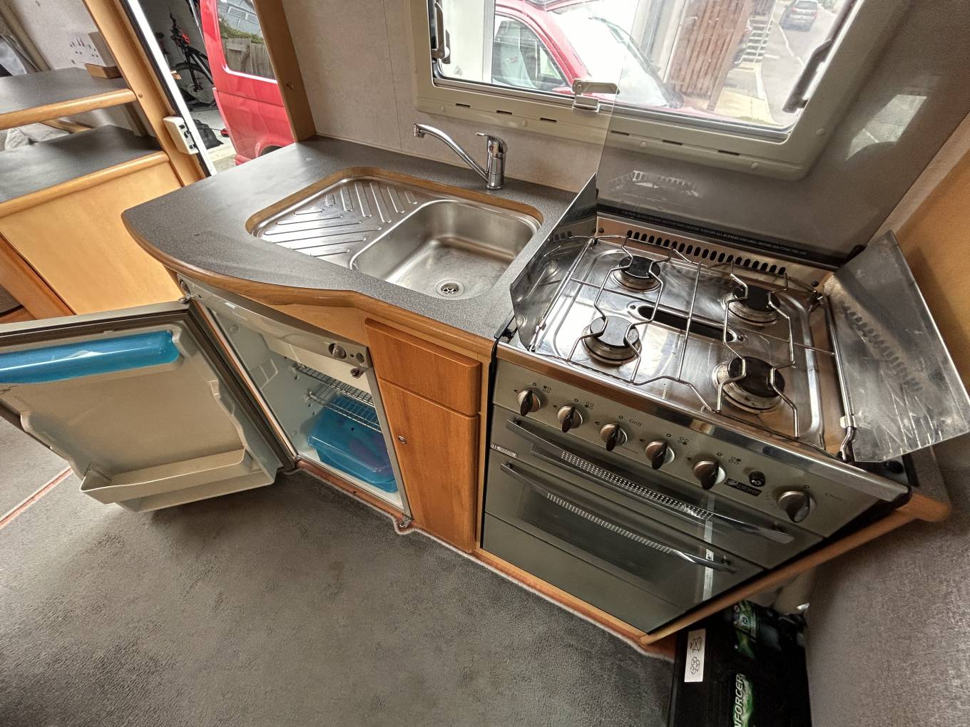 The kitchen is mid habitation and has lots of storage space with cupboards and draws allowing you to store away all of the required pots and pans, and gives you everything you need to cook up a hearty meal for any occasion, included in the kitchen you have, 4 gas burner hob, a 3 way fridge with freezer box, washbasin, and separate grill and oven. With the kitchen being next to the Habitation door you also benefit from extra ventilation when preparing your meal of choice.