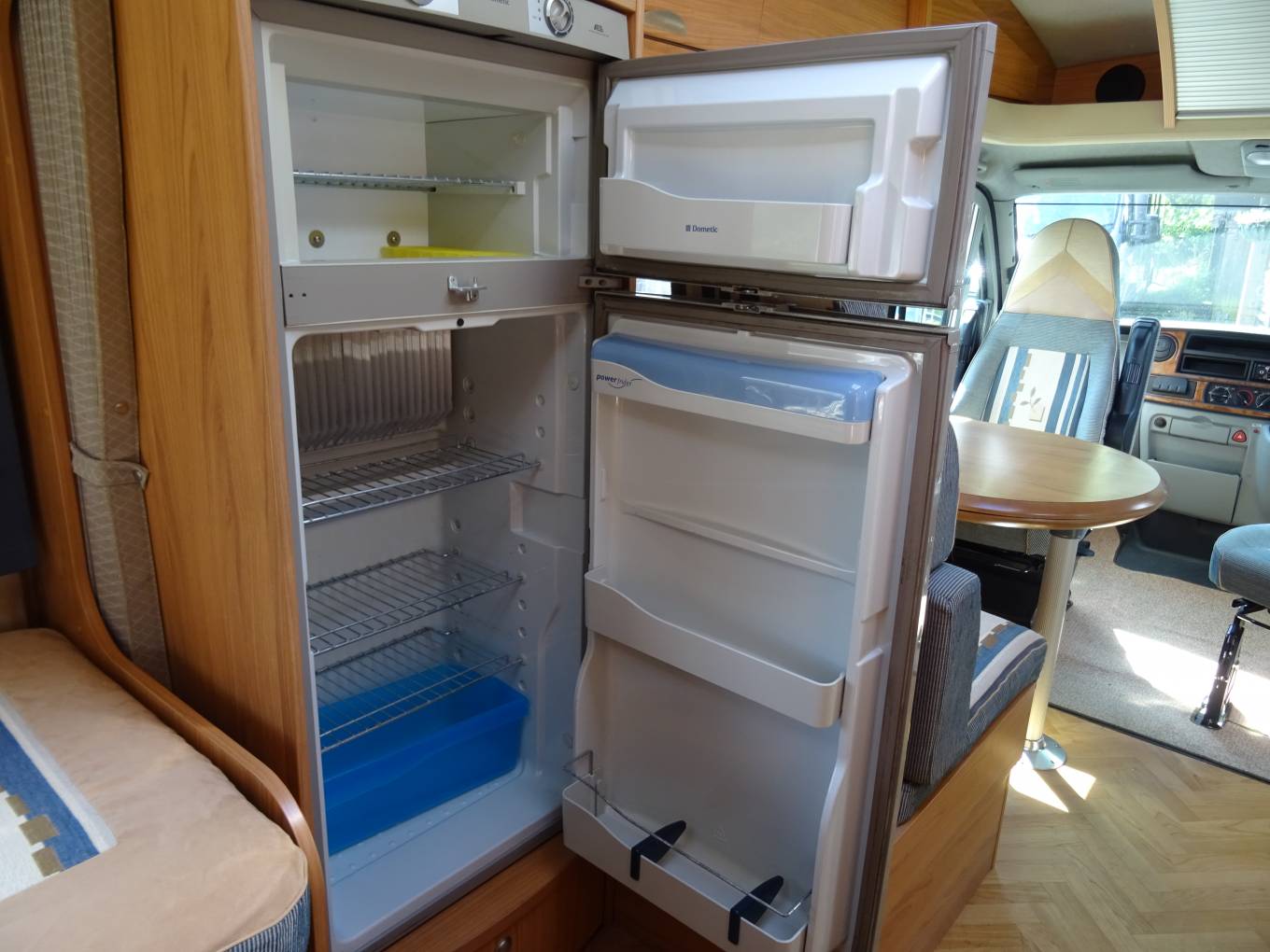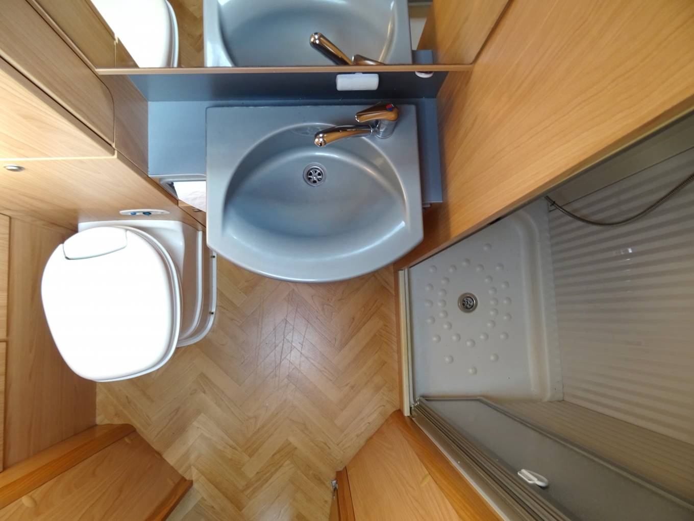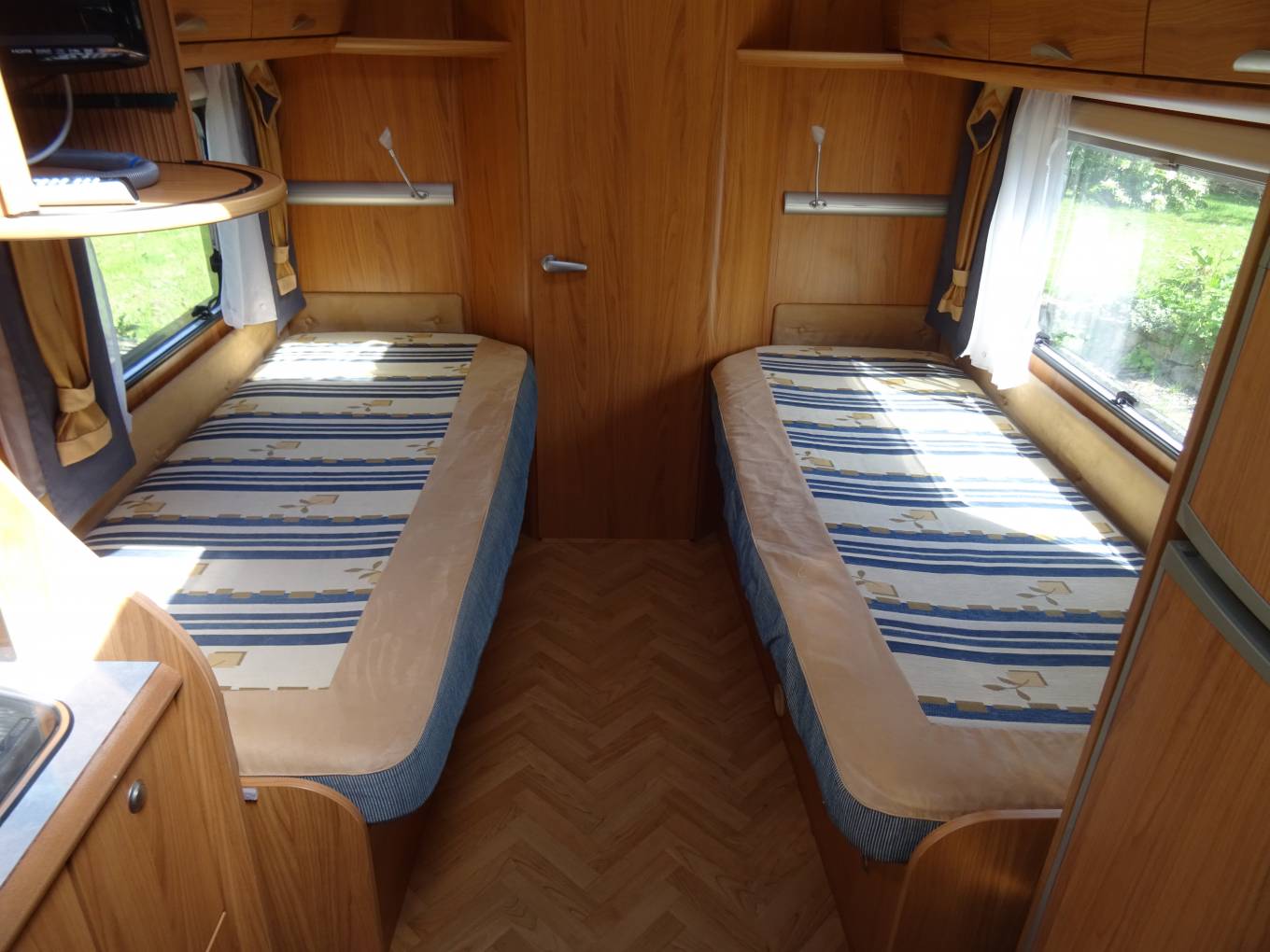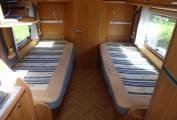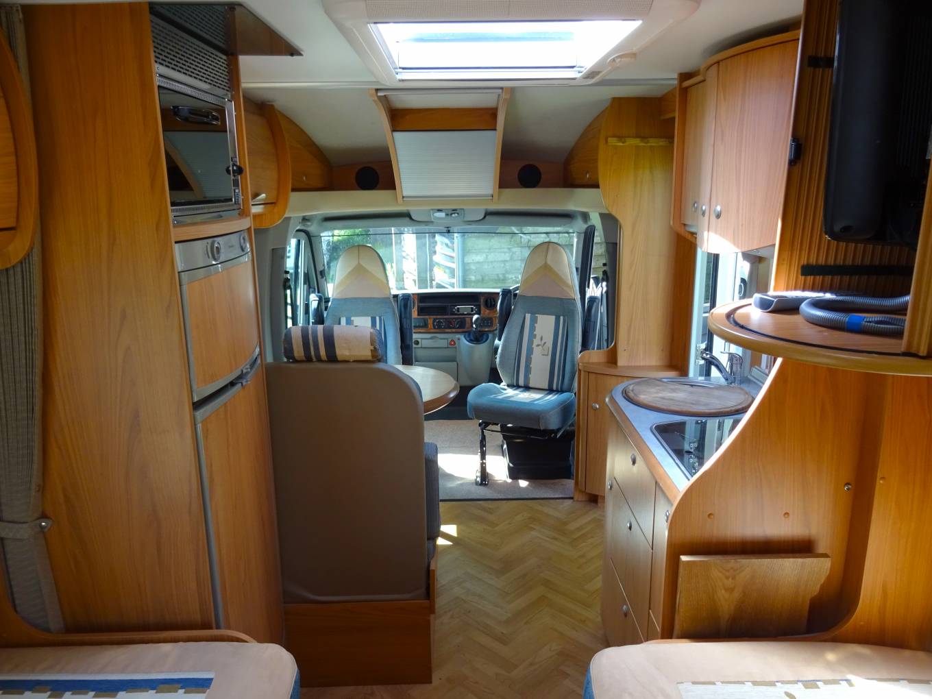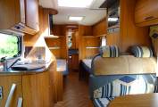 The Motorhome offers flexible living with an ingenious design featuring a rear washroom with separate shower cubicle, fixed single beds and a fully equipped mid kitchen with full fridge freezer, gas hob, oven, grill and sink.