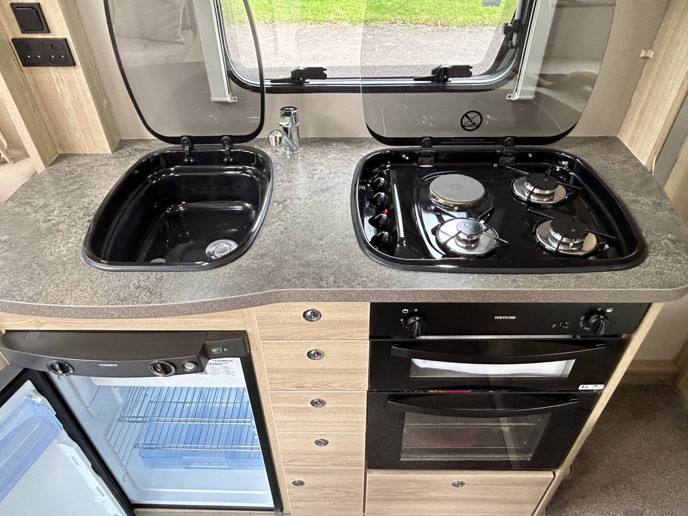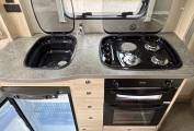 Accomplished cooks will love the kitchen. It's fitted with a gas oven and grill that has hardly been used, a dual-fuel hob with 3 gas burners and an electric hotplate, a Dometic fridge freezer, a Russell Hobbs microwave oven, a sink with mixer tap and lots of cupboard and drawer space. There is also a fold out leaf which increases the work top area for your food preparation.