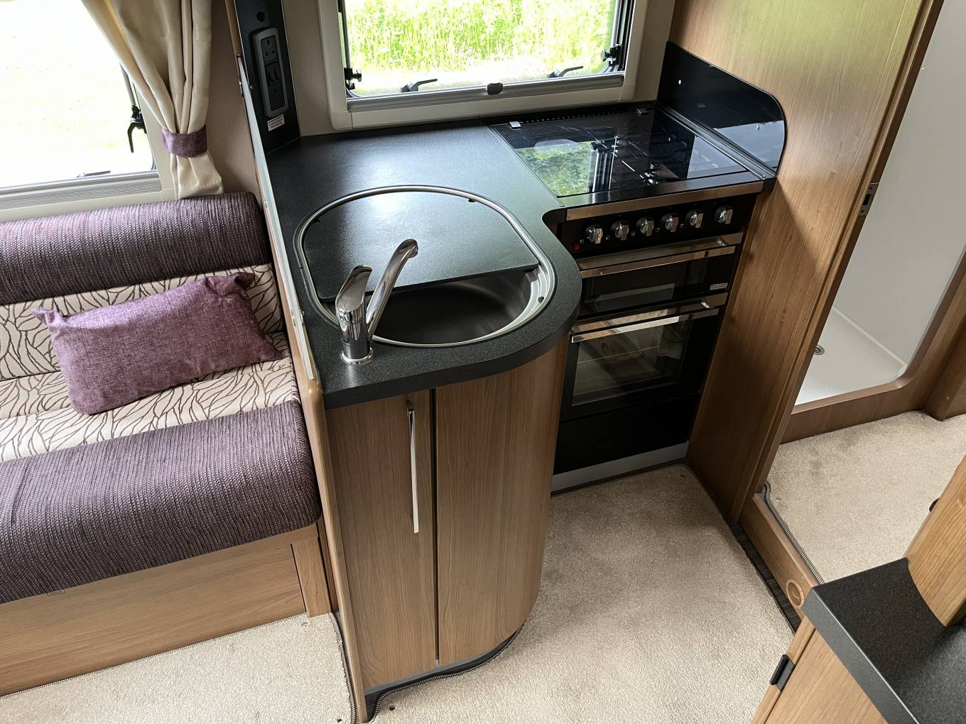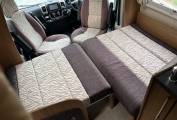 This layout incorporate the 2 front seat swivels in order to create a comfortable and spacious front lounge which is next to the well equipped kitchen that has all the usual appliances.