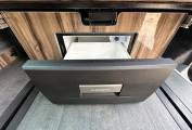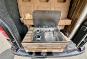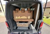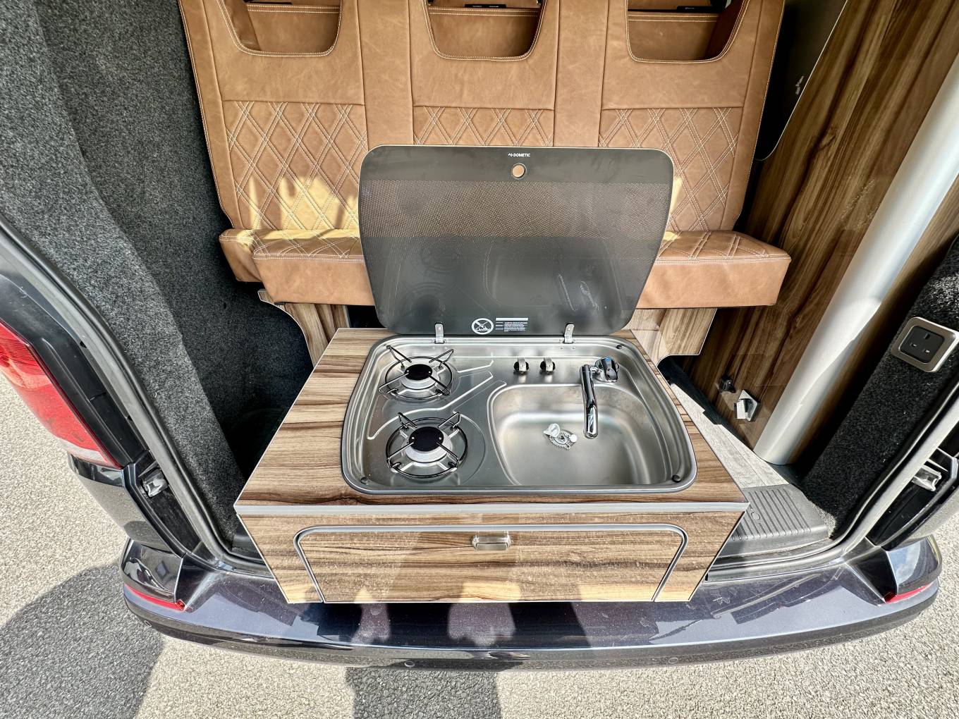 Firstly, we start at the rear where you can pull out a kitchen pod. The pod includes a 2 ring gas hob, wash basin and storage. Next, we have a comfortable huge rock and roll bed, complete with 3 seat belts. The front seats both swivel and there is a dinette table neatly tucked away in the sliding door, to create a comfortable place to relax. There is a fridge draw cleverly placed beneath the seat and extra storage units down the side.