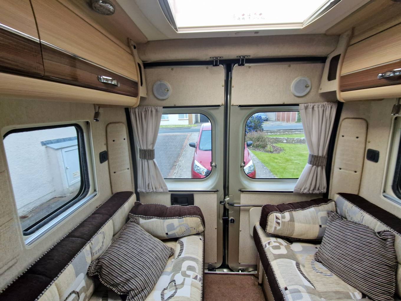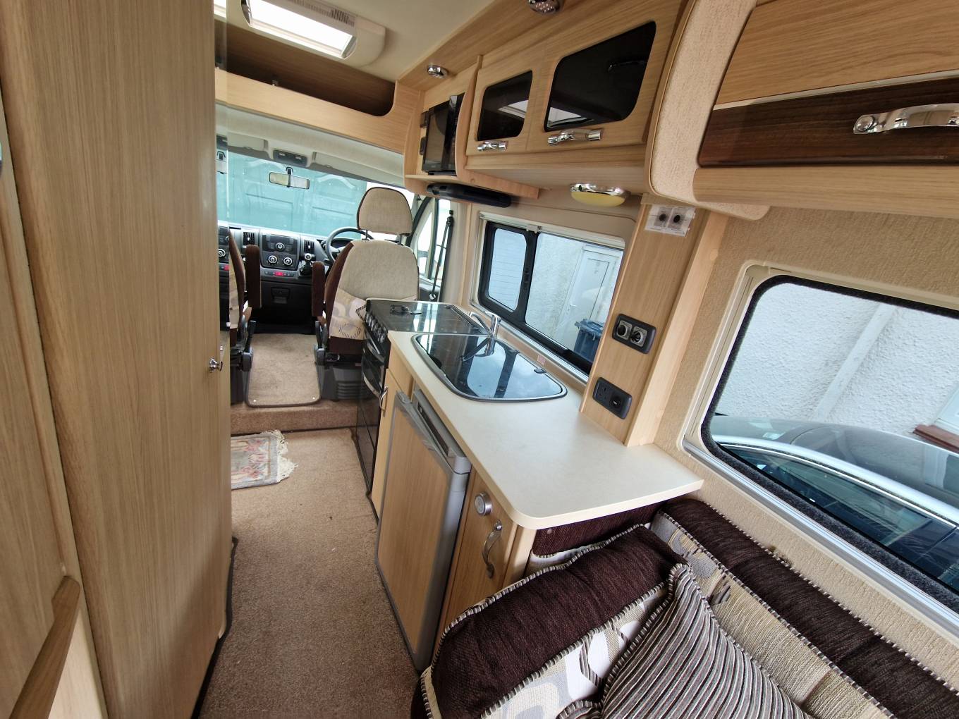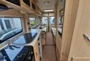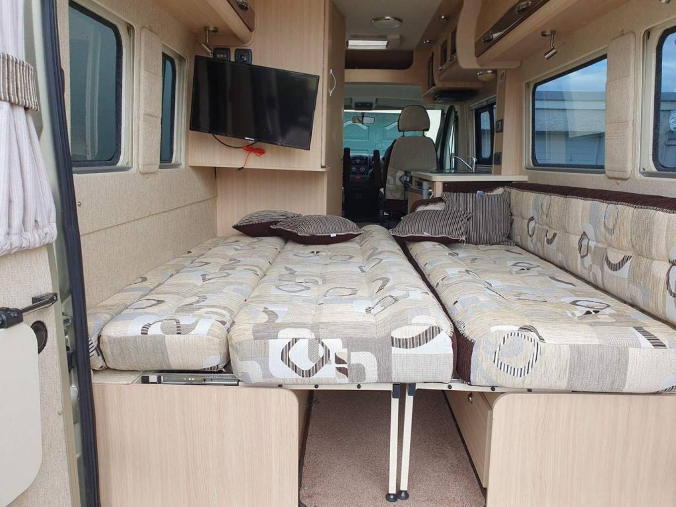 This compact motorhome has lots to offer such as a huge double bed which can be made up in a matter of seconds or simple use as two single Beds, excellent toilet and washroom facilities with pull down wash basin. You will also get a good sized kitchen area with lots of workspace that will also give you 3x gas hobs and hot plate, a grill/oven, extractor fan, microwave and a large fridge with freezer box. In the cab of the motorhome you will have a large touch screen radio, air conditioning and a reverse camera viewing screen making parking no hassle.