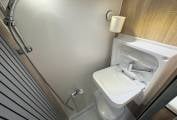 The washroom sits adjacent from the kitchen, this houses the cassette toilet, sink with tap and shower.
