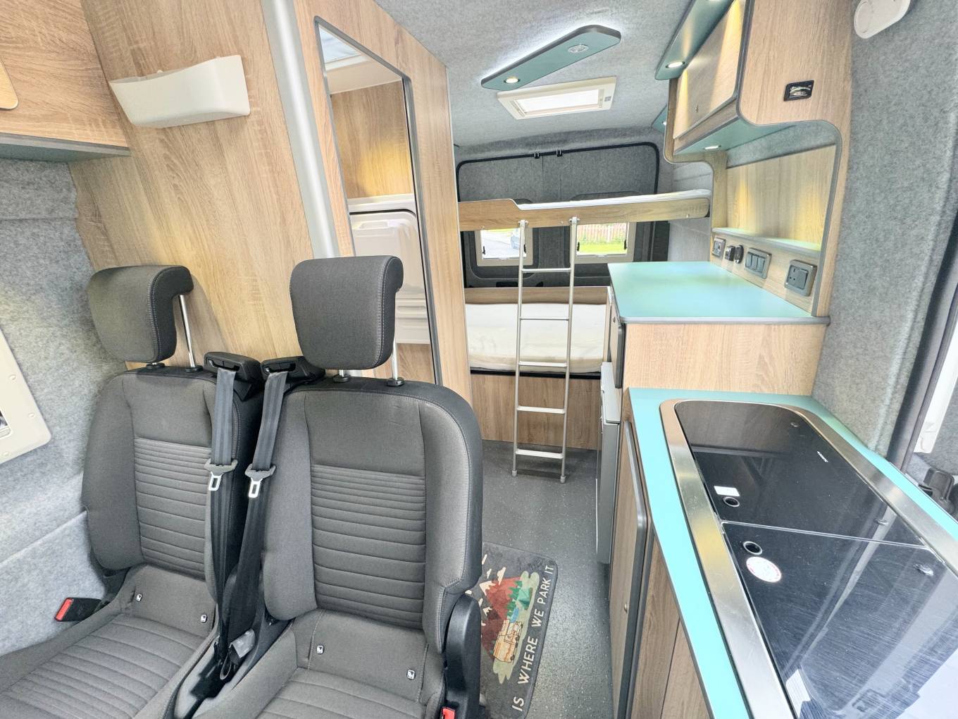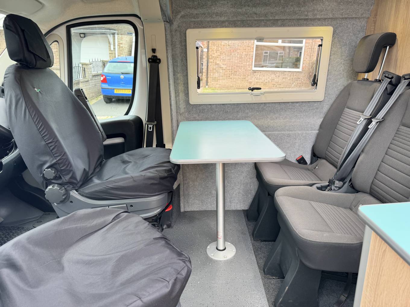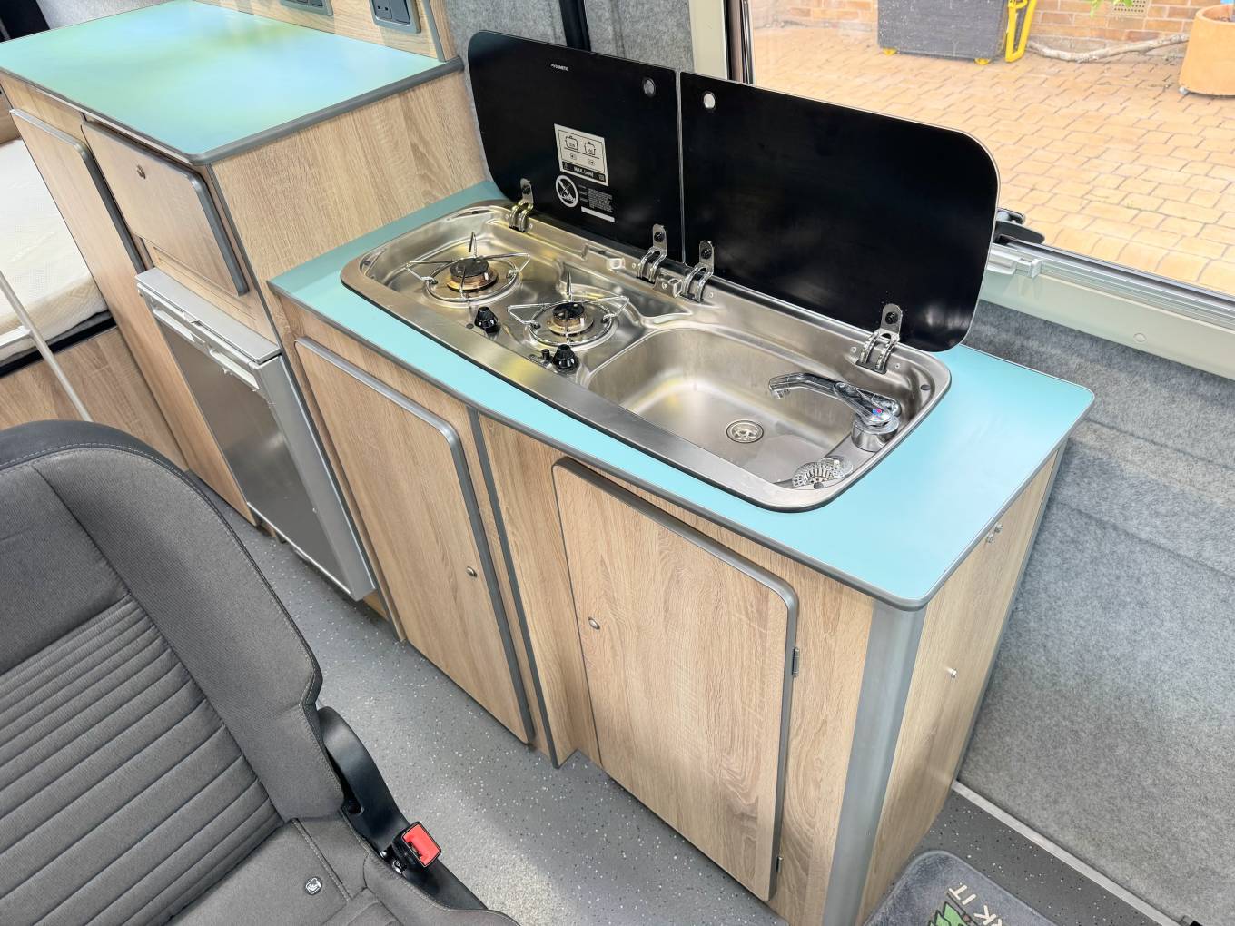 Stepping inside the camper van through the side door, entry made easy with the step, you have the kitchen/ dining area. The drivers and passenger seats swivel so 4 people can dine together using all travelling seats and enjoy an evening in with entertainment in full comfort.