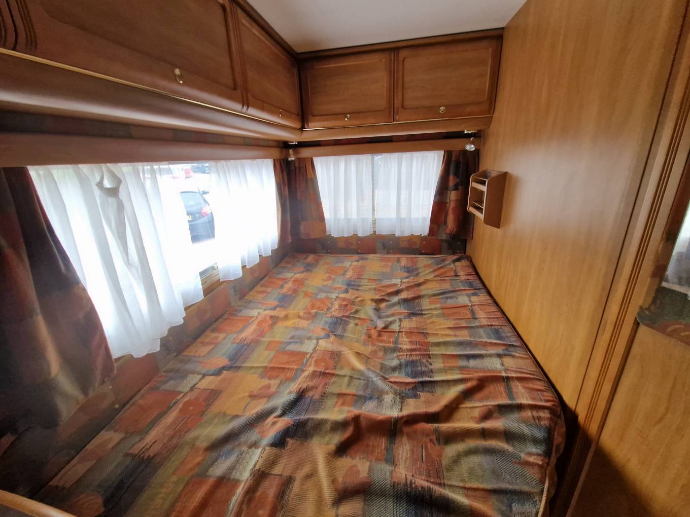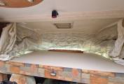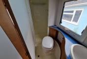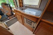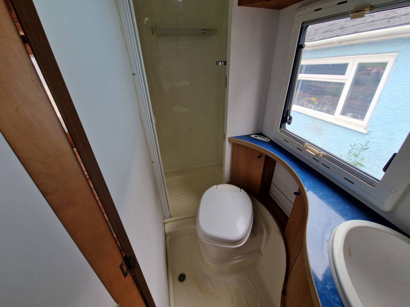 At the rear you have a fixed French double bed which means that you don't have the hassle of making up and putting away a bed each day and underneath it is a large storage area. The rear bed measures approximately 74 x 53 inches and the other two berths are courtesy of the large overcab bed which measures approximately 75 x 51 inches. Next to the rear bed is the lovely bathroom which features a separate shower, a cassette toilet, a wash basin with mixer tap, lots of cupboard space and a large mirror as well as a bathroom window and a skylight above the shower.